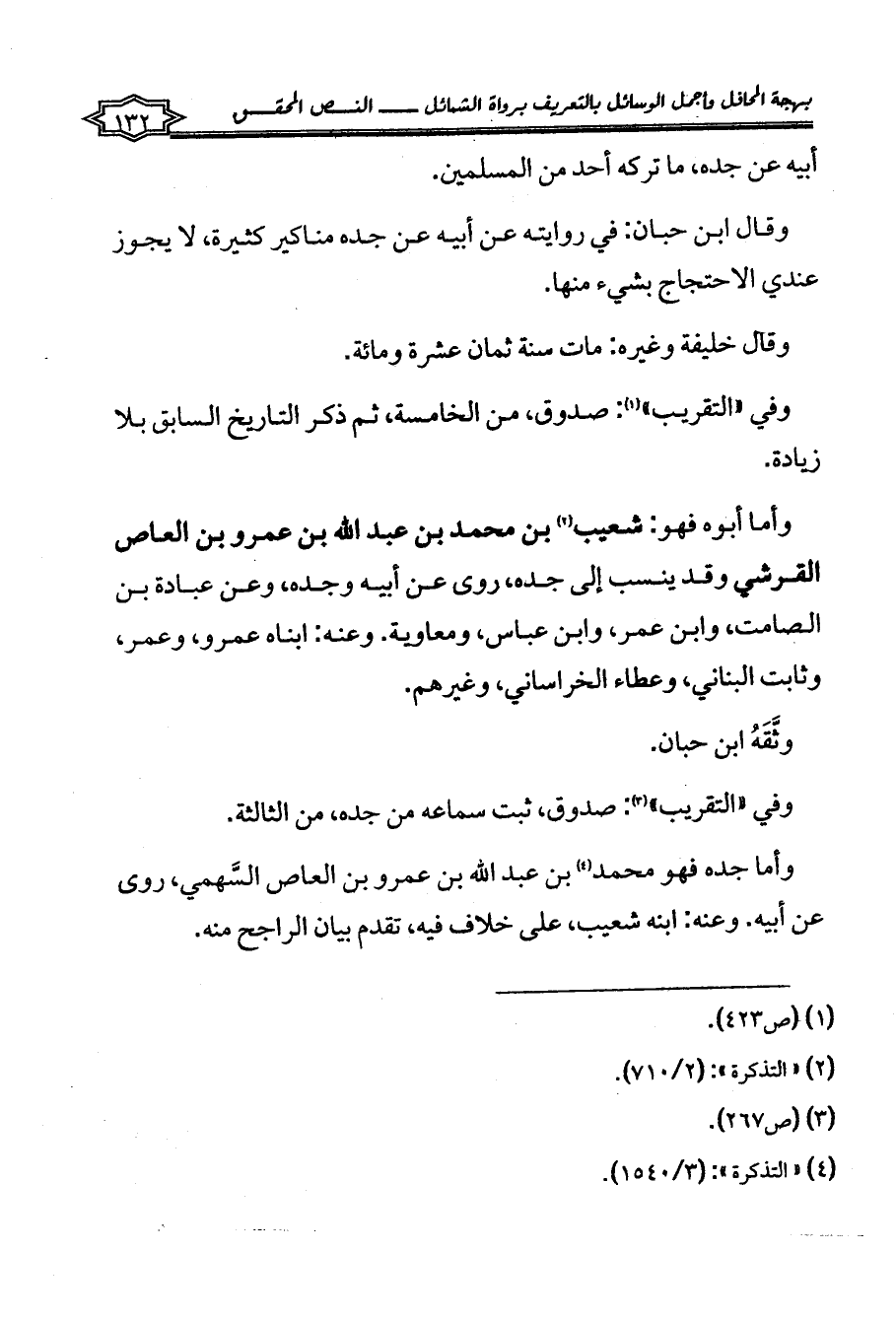 وأما أبوه فهو: شعيب (¬2) بن محمد بن عبد الله بن عمرو بن العاص القرشي وقد ينسب إلى جده، روى عن أبيه وجده، وعن عبادة بن الصامت، وابن عمر، وابن عباس، ومعاوية. وعنه: ابناه عمرو، وعمر، وثابت البناني، وعطاء الخراساني، وغيرهم.