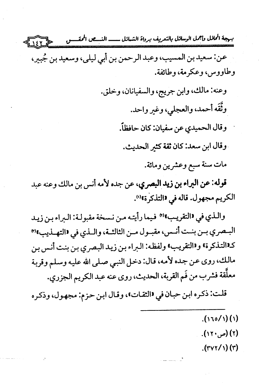 والذي في «التقريب» (¬2) فيما رأيته من نسخة مقبولة: البراء بن زيد البصري بن بنت أنس، مقبول من الثالثة، والذي في «التهذيب» (¬3) كـ «التذكرة» و «التقريب» ولفظه: البراء بن زيد البصري بن بنت أنس بن مالك، روى عن جده لأمه، قال: دخل النبي صلى الله عليه وسلم وقربة معلَّقة فشرب من فَم القربة، الحديث، روى عنه عبد الكريم الجزري.