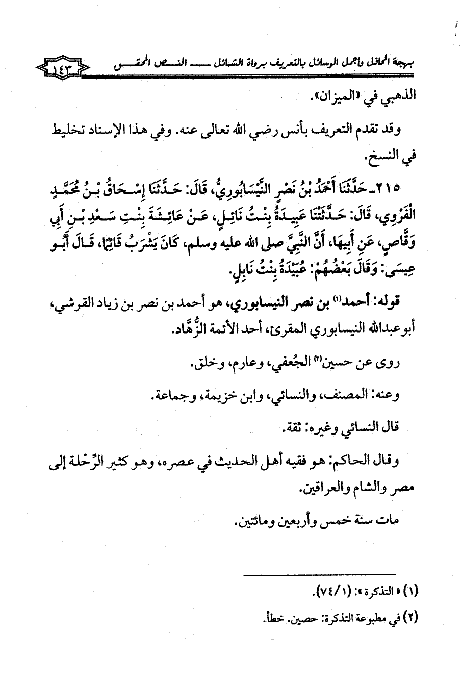 قوله: أحمد (¬1) بن نصر النيسابوري، هو أحمد بن نصر بن زياد القرشي، أبوعبد الله النيسابوري المقرئ، أحد الأئمة الزُّهَّاد.
