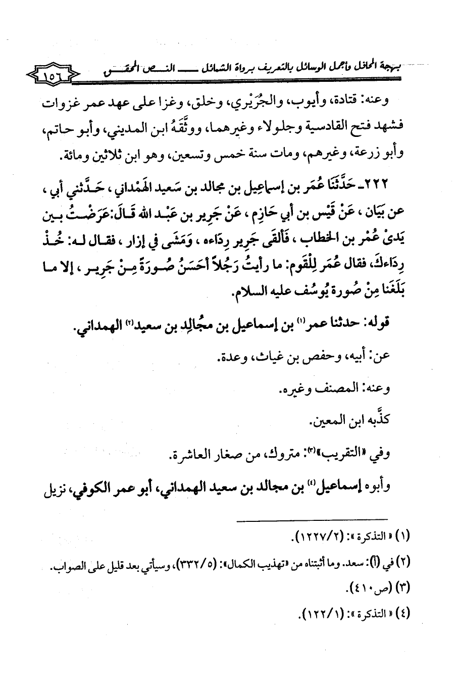 222 - حَدَّثَنَا عُمَر بن إسماعِيل بن مجالد بن سَعيد الهَمْداني , حَدَّثني أبي , عن بَيَان , عَنْ قَيْس بن أبي حَازِم , عَنْ جَرِير بن عَبْد الله قَالَ: عَرَضْتُ بين يَدىْ عُمْر بن الخطاب , فَألقَى جَرِير رِدَاءه , وَمَشَى في إزار , فقال له: خُذْ رِدَاءكَ, فقال عُمَر لِلْقَوم: ما رأيتُ رَجُلاً أحَسَنُ صُورَةً مِنْ جَرِير , إلا ما بَلَغَنا مِنْ صُورة يُوسُف عليه السلام.