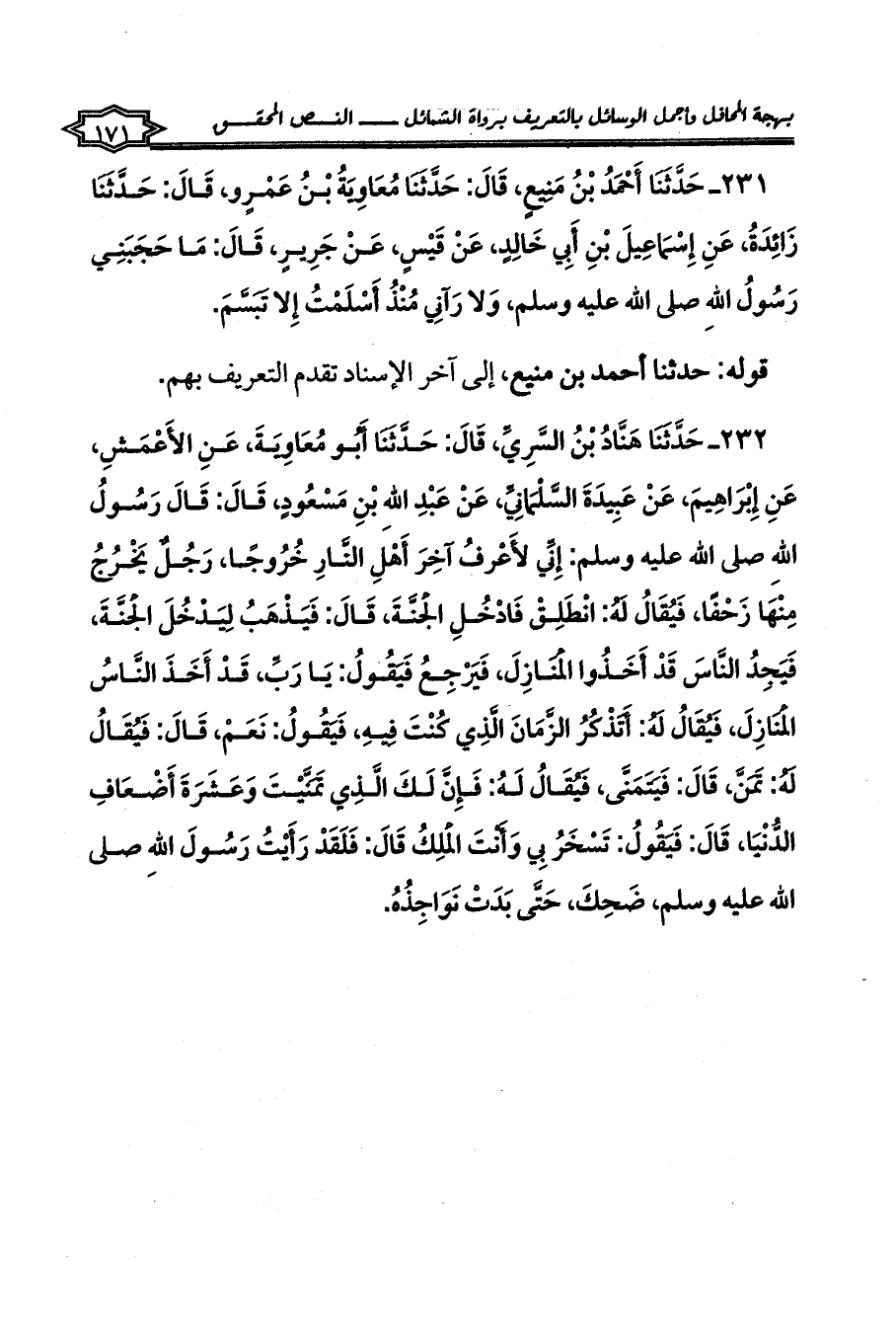 232 - حَدَّثَنَا هَنَّادُ بْنُ السَّرِيِّ، قَالَ: حَدَّثَنَا أَبُو مُعَاوِيَةَ، عَنِ الأَعْمَشِ، عَنِ إِبْرَاهِيمَ، عَنْ عَبِيدَةَ السَّلْمَانِيِّ، عَنْ عَبْدِ اللهِ بْنِ مَسْعُودٍ، قَالَ: قَالَ رَسُولُ اللهِ صلى الله عليه وسلم: إِنِّي لأَعْرفُ آخِرَ أَهْلِ النَّارِ خُرُوجًا، رَجُلٌ يَخْرُجُ مِنْهَا زَحْفًا، فَيُقَالُ لَهُ: انْطَلِقْ فَادْخُلِ الْجَنَّةَ، قَالَ: فَيَذْهَبُ لِيَدْخُلَ الْجَنَّةَ، فَيَجِدُ النَّاسَ قَدْ أَخَذُوا الْمَنَازِلَ، فَيَرْجِعُ فَيَقُولُ: يَا رَبِّ، قَدْ أَخَذَ النَّاسُ الْمَنَازِلَ، فَيُقَالُ لَهُ: أَتَذْكُرُ الزَّمَانَ الَّذِي كُنْتَ فِيهِ، فَيَقُولُ: نَعَمْ، قَالَ: فَيُقَالُ لَهُ: تَمَنَّ، قَالَ: فَيَتَمَنَّى، فَيُقَالُ لَهُ: فَإِنَّ لَكَ الَّذِي تَمَنَّيْتَ وَعَشَرَةَ أَضْعَافِ الدُّنْيَا، قَالَ: فَيَقُولُ: تَسْخَرُ بِي وَأَنْتَ الْمَلِكُ قَالَ: فَلَقَدْ رَأَيْتُ رَسُولَ اللهِ صلى الله عليه وسلم، ضَحِكَ، حَتَّى بَدَتْ نَوَاجِذُهُ.