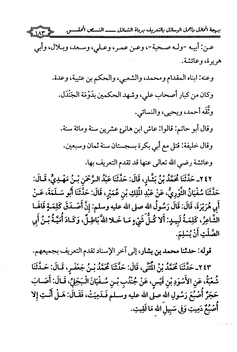 242 - حَدَّثَنَا مُحَمَّدُ بْنُ بَشَّارٍ، قَالَ: حَدَّثَنَا عَبْدُ الرَّحْمَنِ بْنُ مَهْدِيٍّ، قَالَ: حَدَّثَنَا سُفْيَانُ الثَّوْرِيُّ، عَنْ عَبْدِ الْمَلِكِ بْنِ عُمَيْرٍ، قَالَ: حَدَّثَنَا أَبُو سَلَمَةَ، عَنْ أَبِي هُرَيْرَةَ، قَالَ: قَالَ رَسُولُ اللهِ صلى الله عليه وسلم: إِنَّ أَصْدَقَ كَلِمَةٍ قَالَهَا الشَّاعِرُ، كَلِمَةُ لَبِيدٍ: أَلا كُلُّ شَيْءٍ مَا خَلا اللَّهَ بَاطِلٌ، وَكَادَ أُمَيَّةُ بْنُ أَبِي الصَّلْتِ أَنْ يُسْلِمَ.