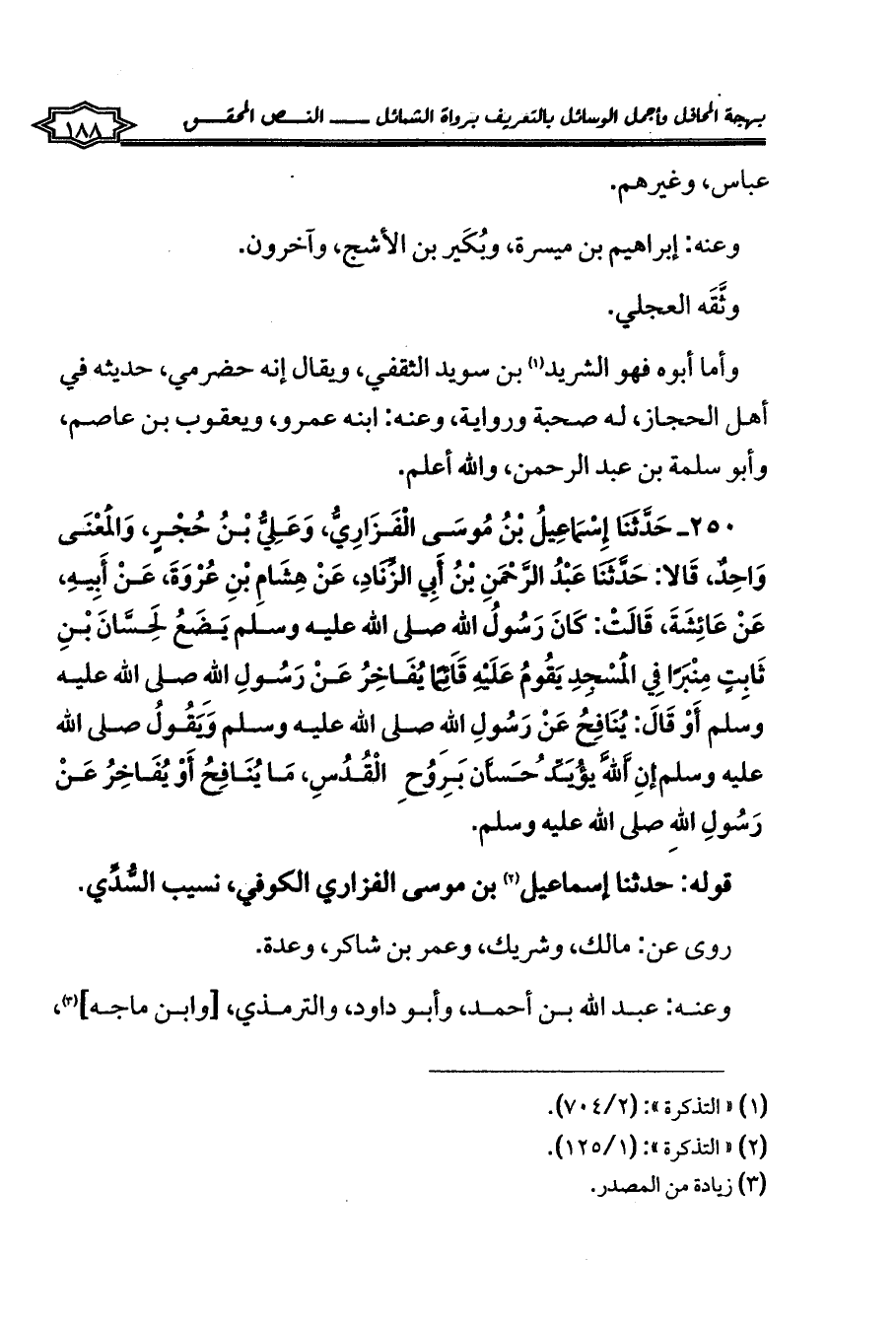 250 - حَدَّثَنَا إِسْمَاعِيلُ بْنُ مُوسَى الْفَزَارِيُّ، وَعَلِيُّ بْنُ حُجْرٍ، وَالْمَعْنَى وَاحِدٌ، قَالا: حَدَّثَنَا عَبْدُ الرَّحْمَنِ بْنُ أَبِي الزِّنَادِ، عَنْ هِشَامِ بْنِ عُرْوَةَ، عَنْ أَبِيهِ، عَنْ عَائِشَةَ، قَالَتْ: كَانَ رَسُولُ اللهِ صلى الله عليه وسلم يَضَعُ لِحَسَّانَ بْنِ ثَابِتٍ مِنْبَرًا فِي الْمَسْجِدِ يَقُومُ عَلَيْهِ قَائِمًا يُفَاخِرُ عَنْ رَسُولِ اللهِ صلى الله عليه وسلم أَوْ قَالَ: يُنَافِحُ عَنْ رَسُولِ اللهِ صلى الله عليه وسلم وَيَقُولُ صلى الله عليه وسلم: إِنَّ اللَّهَ يُؤَيِّدُ حَسَّانَ بِرُوحِ الْقُدُسِ، مَا يُنَافِحُ أَوْ يُفَاخِرُ عَنْ رَسُولِ اللهِ صلى الله عليه وسلم.
