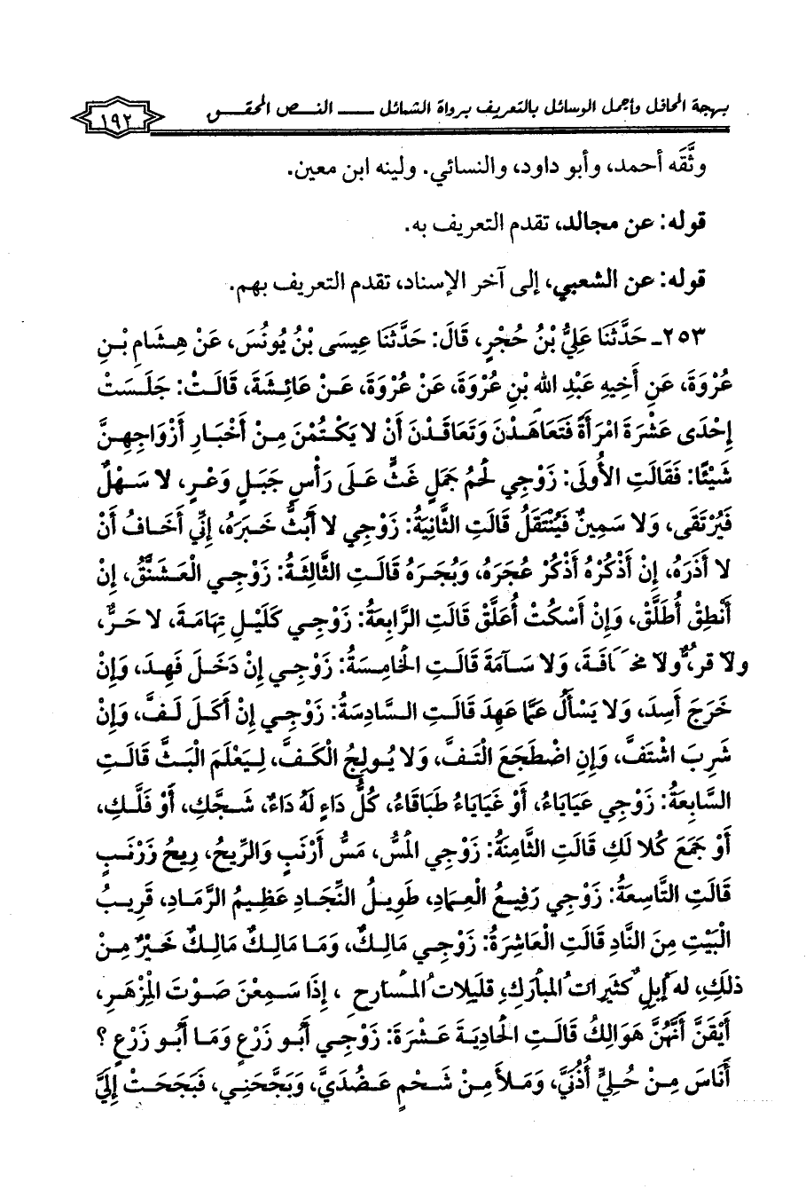 253 - حَدَّثَنَا عَلِيُّ بْنُ حُجْرٍ، قَالَ: حَدَّثَنَا عِيسَى بْنُ يُونُسَ، عَنْ هِشَامِ بْنِ عُرْوَةَ، عَنِ أَخِيهِ عَبْدِ اللهِ بْنِ عُرْوَةَ، عَنْ عُرْوَةَ، عَنْ عَائِشَةَ، قَالَتْ: جَلَسَتْ إِحْدَى عَشْرَةَ امْرَأَةً فَتَعَاهَدْنَ وَتَعَاقَدْنَ أَنْ لا يَكْتُمْنَ مِنْ أَخْبَارِ أَزْوَاجِهِنَّ شَيْئًا: فَقَالَتِ الأُولَى: زَوْجِي لَحْمُ جَمَلٍ غَثٍّ عَلَى رَأْسِ جَبَلٍ وَعْرٍ، لا سَهْلٌ فَيُرْتَقَى، وَلا سَمِينٌ فَيُنْتَقَلُ قَالَتِ الثَّانِيَةُ: زَوْجِي لا أَبُثُّ خَبَرَهُ، إِنِّي أَخَافُ أَنْ لا أَذَرَهُ، إِنْ أَذْكُرْهُ أَذْكُرْ عُجَرَهُ، وَبُجَرَهُ قَالَتِ الثَّالِثَةُ: زَوْجِي الْعَشَنَّقُ، إِنْ أَنْطِقْ أُطَلَّقْ، وَإِنْ أَسْكُتْ أُعَلَّقْ قَالَتِ الرَّابِعَةُ: زَوْجِي كَلَيْلِ تِهَامَةَ، لا حَرٌّ، وَلا قُرٌّ، وَلا مَخَافَةَ، وَلا سَآمَةَ قَالَتِ الْخَامِسَةُ: زَوْجِي إِنْ دَخَلَ فَهِدَ، وَإِنْ خَرَجَ أَسِدَ، وَلا يَسْأَلُ عَمَّا عَهِدَ قَالَتِ السَّادِسَةُ: زَوْجِي إِنْ أَكَلَ لَفَّ، وَإِنْ شَرِبَ اشْتَفَّ، وَإِنِ اضْطَجَعَ الْتَفَّ، وَلا يُولِجُ الْكَفَّ، لِيَعْلَمَ الْبَثَّ قَالَتِ السَّابِعَةُ: زَوْجِي عَيَايَاءُ، أَوْ غَيَايَاءُ طَبَاقَاءُ، كُلُّ دَاءٍ لَهُ دَاءٌ، شَجَّكِ، أَوْ فَلَّكِ، أَوْ جَمَعَ كُلا لَكِ قَالَتِ الثَّامِنَةُ: زَوْجِي الْمَسُّ، مَسُّ أَرْنَبٍ وَالرِّيحُ، رِيحُ زَرْنَبٍ قَالَتِ التَّاسِعَةُ: زَوْجِي رَفِيعُ الْعِمَادِ، طَوِيلُ النِّجَادِ عَظِيمُ الرَّمَادِ، قَرِيبُ الْبَيْتِ مِنَ النَّادِ قَالَتِ الْعَاشِرَةُ: زَوْجِي مَالِكٌ، وَمَا مَالِكٌ مَالِكٌ خَيْرٌ مِنْ ذَلِكِ، لَهُ إِبِلٌ كَثِيرَاتُ الْمَبَارِكِ، قَلِيلاتُ الْمَسَارِحِ، إِذَا سَمِعْنَ صَوْتَ الْمِزْهَرِ، أَيْقَنَّ أَنَّهُنَّ هَوَالِكُ قَالَتِ الْحَادِيَةَ عَشْرَةَ: زَوْجِي أَبُو زَرْعٍ وَمَا أَبُو زَرْعٍ؟ أَنَاسَ مِنْ حُلِيٍّ أُذُنَيَّ، وَمَلأَ مِنْ شَحْمٍ عَضُدَيَّ، وَبَجَّحَنِي، فَبَجَحَتْ إِلَيَّ
