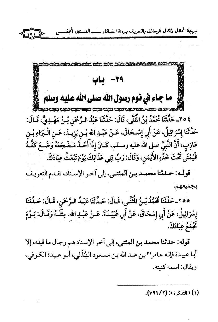 254 - حَدَّثَنَا مُحَمَّدُ بْنُ الْمُثَنَّى، قَالَ: حَدَّثَنَا عَبْدُ الرَّحْمَنِ بْنُ مَهْدِيٍّ، قَالَ: حَدَّثَنَا إِسْرَائِيلُ، عَنْ أَبِي إِسْحَاقَ، عَنْ عَبْدِ اللهِ بْنِ يَزِيدَ، عَنِ الْبَرَاءِ بْنِ عَازِبٍ، أَنَّ النَّبِيَّ صلى الله عليه وسلم، كَانَ إِذَا أَخَذَ مَضْجَعَهُ وَضَعَ كَفَّهُ الْيُمْنَى تَحْتَ خَدِّهِ الأَيْمَنِ، وَقَالَ: رَبِّ قِنِي عَذَابَكَ يَوْمَ تَبْعَثُ عِبَادَكَ.