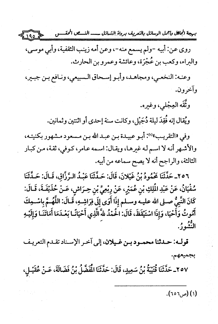 وفي «التقريب» (¬1): أبو عبيدة بن عبد الله بن مسعود مشهور بكنيته، والأشهر أنه لا اسم له غيرها، ويقال: اسمه عامر، كوفي، ثقة، من كبار الثالثة، والراجح أنه لا يصح سماعه من أبيه.