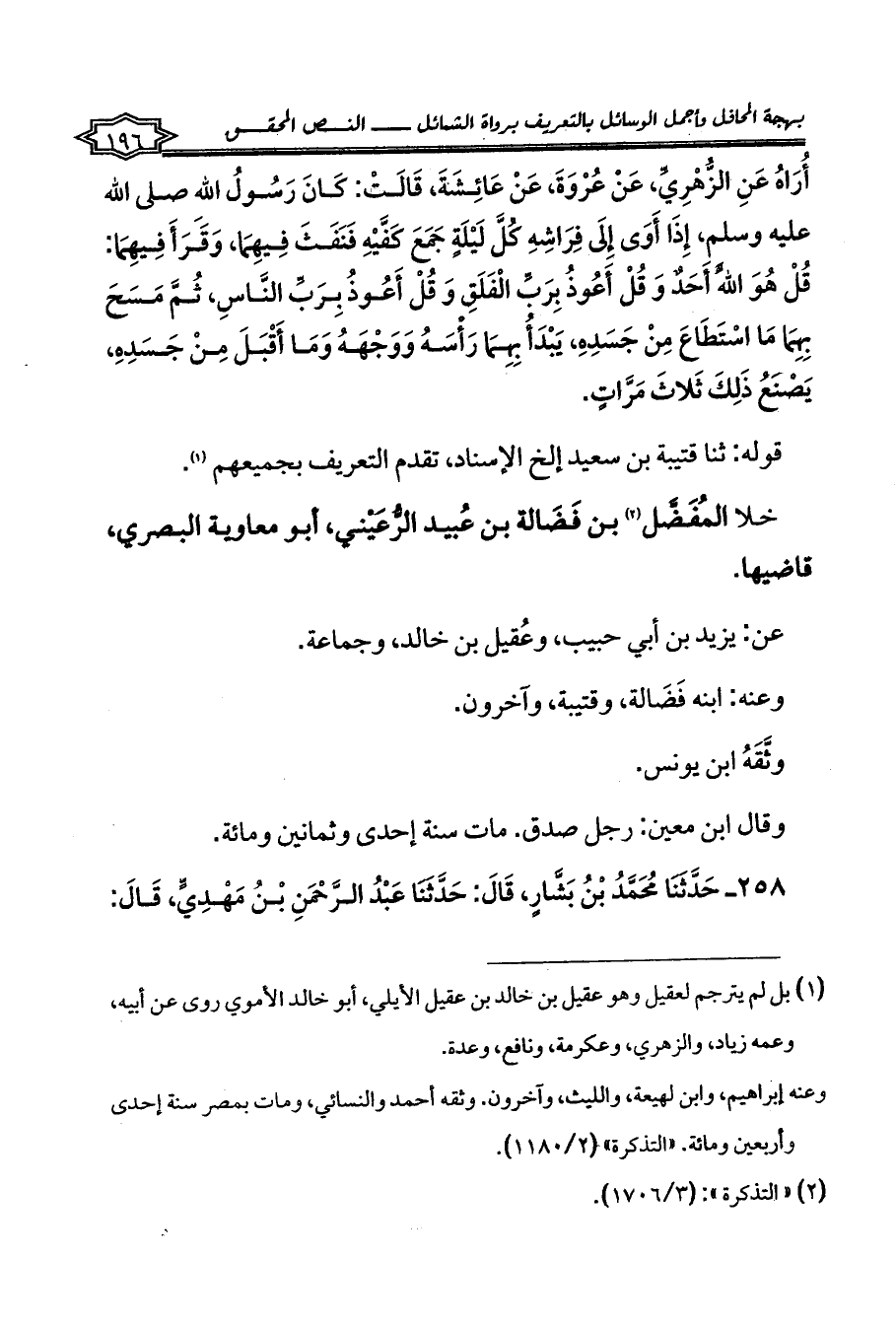 أُرَاهُ عَنِ الزُّهْرِيِّ، عَنْ عُرْوَةَ، عَنْ عَائِشَةَ، قَالَتْ: كَانَ رَسُولُ اللهِ صلى الله عليه وسلم، إِذَا أَوَى إِلَى فِرَاشِهِ كُلَّ لَيْلَةٍ جَمَعَ كَفَّيْهِ فَنَفَثَ فِيهِمَا، وَقَرَأَ فِيهِمَا: قُلْ هُوَ اللَّهُ أَحَدٌ وَقُلْ أَعُوذُ بِرَبِّ الْفَلَقِ وَقُلْ أَعُوذُ بِرَبِّ النَّاسِ، ثُمَّ مَسَحَ بِهِمَا مَا اسْتَطَاعَ مِنْ جَسَدِهِ، يَبْدَأُ بِهِمَا رَأْسَهُ وَوَجْهَهُ وَمَا أَقْبَلَ مِنْ جَسَدِهِ، يَصْنَعُ ذَلِكَ ثَلاثَ مَرَّاتٍ.