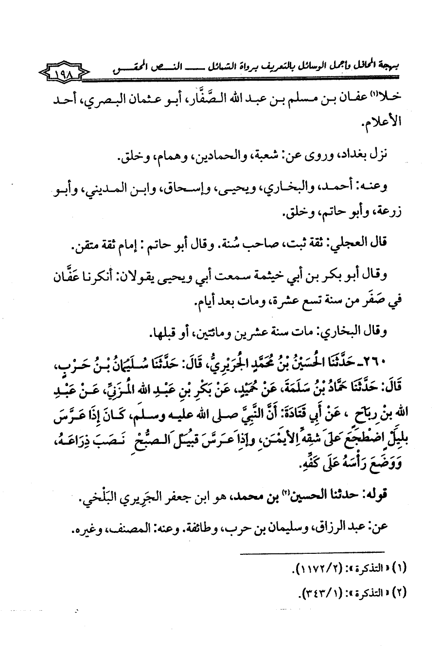 260 - حَدَّثَنَا الْحُسَيْنُ بْنُ مُحَمَّدٍ الْجُرَيْرِيُّ، قَالَ: حَدَّثَنَا سُلَيْمَانُ بْنُ حَرْبٍ، قَالَ: حَدَّثَنَا حَمَّادُ بْنُ سَلَمَةَ، عَنْ حُمَيْدٍ، عَنْ بَكْرِ بْنِ عَبْدِ اللهِ الْمُزَنِيِّ، عَنْ عَبْدِ اللهِ بْنِ رَبَاحٍ، عَنْ أَبِي قَتَادَةَ: أَنَّ النَّبِيَّ صلى الله عليه وسلم، كَانَ إِذَا عَرَّسَ بِلَيْلٍ اضْطَجَعَ عَلَى شِقِّهِ الأَيْمَنِ، وَإِذَا عَرَّسَ قُبَيْلَ الصُّبْحِ نَصَبَ ذِرَاعَهُ، وَوَضَعَ رَأْسَهُ عَلَى كَفِّهِ.