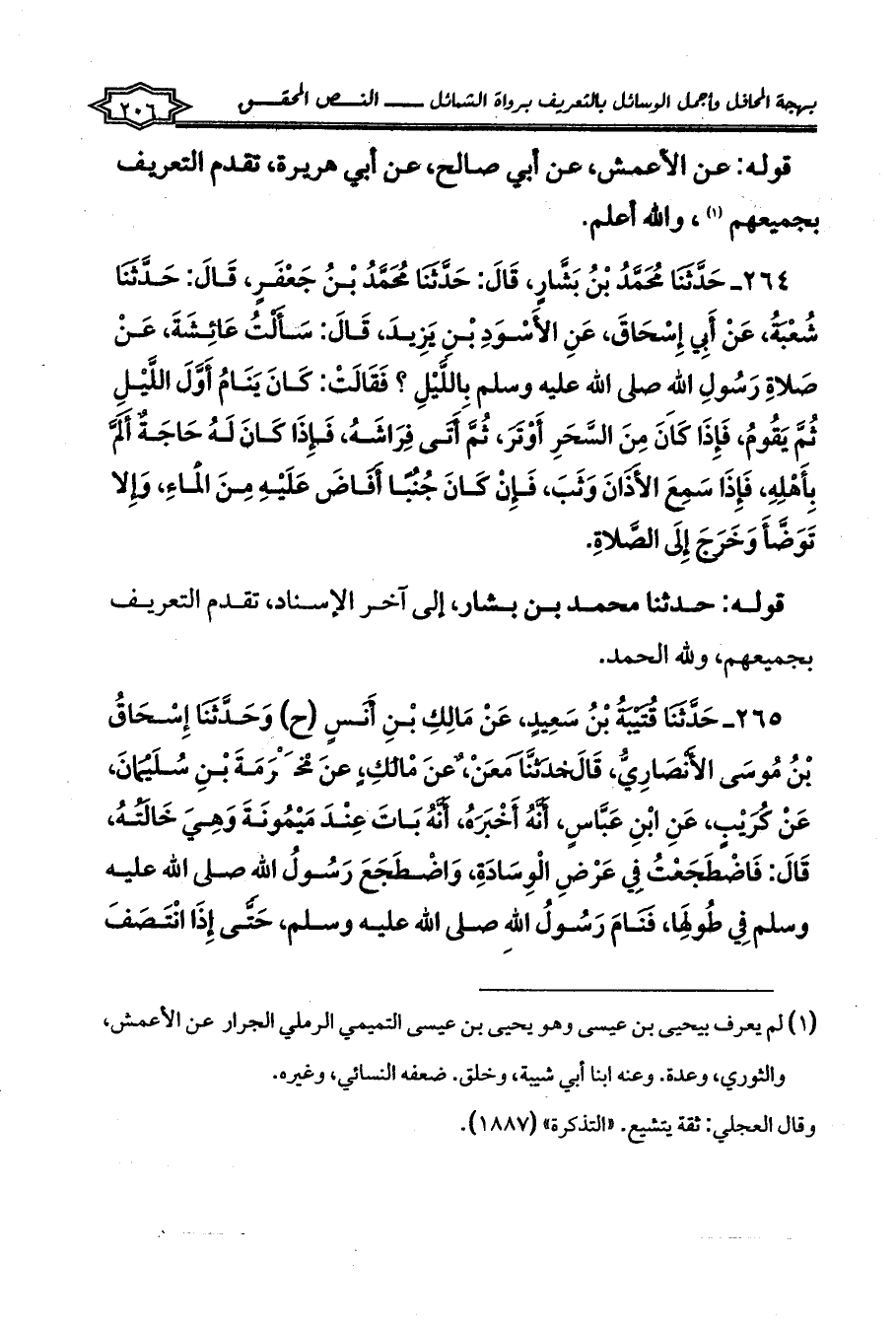 264 - حَدَّثَنَا مُحَمَّدُ بْنُ بَشَّارٍ، قَالَ: حَدَّثَنَا مُحَمَّدُ بْنُ جَعْفَرٍ، قَالَ: حَدَّثَنَا شُعْبَةُ، عَنْ أَبِي إِسْحَاقَ، عَنِ الأَسْوَدِ بْنِ يَزِيدَ، قَالَ: سَأَلْتُ عَائِشَةَ، عَنْ صَلاةِ رَسُولِ اللهِ صلى الله عليه وسلم بِاللَّيْلِ؟ فَقَالَتْ: كَانَ يَنَامُ أَوَّلَ اللَّيْلِ ثُمَّ يَقُومُ، فَإِذَا كَانَ مِنَ السَّحَرِ أَوْتَرَ، ثُمَّ أَتَى فِرَاشَهُ، فَإِذَا كَانَ لَهُ حَاجَةٌ أَلَمَّ بِأَهْلِهِ، فَإِذَا سَمِعَ الأَذَانَ وَثَبَ، فَإِنْ كَانَ جُنُبًا أَفَاضَ عَلَيْهِ مِنَ الْمَاءِ، وَإِلا تَوَضَّأَ وَخَرَجَ إِلَى الصَّلاةِ.