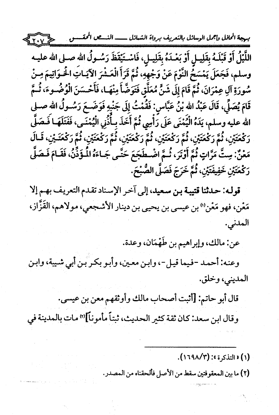 اللَّيْلُ أَوْ قَبْلَهُ بِقَلِيلٍ أَوْ بَعْدَهُ بِقَلِيلٍ، فَاسْتَيْقَظَ رَسُولُ اللهِ صلى الله عليه وسلم، فَجَعَلَ يَمْسَحُ النَّوْمَ عَنْ وَجْهِهِ، ثُمَّ قَرَأَ الْعَشْرَ الآيَاتِ الْخَوَاتِيمَ مِنْ سُورَةِ آلِ عِمْرَانَ، ثُمَّ قَامَ إِلَى شَنٍّ مُعَلَّقٍ فَتَوَضَّأَ مِنْهَا، فَأَحْسَنَ الْوُضُوءَ، ثُمَّ قَامَ يُصَلِّي، قَالَ عَبْدُ اللهِ بْنُ عَبَّاسٍ: فَقُمْتُ إِلَى جَنْبِهِ فَوَضَعَ رَسُولُ اللهِ صلى الله عليه وسلم، يَدَهُ الْيُمْنَى عَلَى رَأْسِي ثُمَّ أَخَذَ بِأُذُنِي الْيُمْنَى، فَفَتَلَهَا فَصَلَّى رَكْعَتَيْنِ، ثُمَّ رَكْعَتَيْنِ، ثُمَّ رَكْعَتَيْنِ، ثُمَّ رَكْعَتَيْنِ، ثُمَّ رَكْعَتَيْنِ، ثُمَّ رَكْعَتَيْنِ، قَالَ مَعْنٌ: سِتَّ مَرَّاتٍ ثُمَّ أَوْتَرَ، ثُمَّ اضْطَجَعَ حَتَّى جَاءَهُ الْمُؤَذِّنُ، فَقَامَ فَصَلَّى رَكْعَتَيْنِ خَفِيفَتَيْنِ، ثُمَّ خَرَجَ فَصَلَّى الصُّبْحَ.