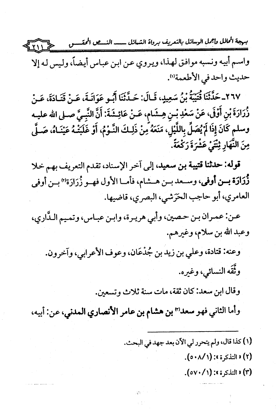 قوله: حدثنا قتيبة بن سعيد، إلى آخر الإسناد، تقدم التعريف بهم خلا زُرَارَة بن أوفى، وسعد بن هشام، فأما الأول فهو زُرَارَة (¬2) بن أوفى العامري، أبو حاجب الحَرَشي، البصري، قاضيها.