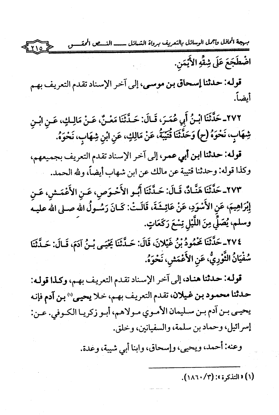 273 - حَدَّثَنَا هَنَّادٌ، قَالَ: حَدَّثَنَا أَبُو الأَحْوَصِ، عَنِ الأَعْمَشِ، عَنِ إِبْرَاهِيمَ، عَنِ الأَسْوَدِ، عَنْ عَائِشَةَ، قَالَتْ: كَانَ رَسُولُ اللهِ صلى الله عليه وسلم، يُصَلِّي مِنَ اللَّيْلِ تِسْعَ رَكَعَاتٍ.