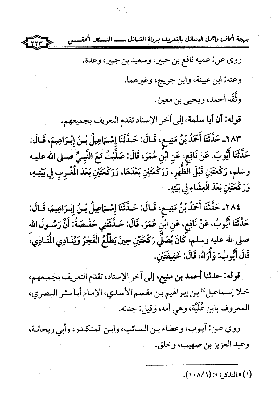 284 - حَدَّثَنَا أَحْمَدُ بْنُ مَنِيعٍ، قَالَ: حَدَّثَنَا إِسْمَاعِيلُ بْنُ إِبْرَاهِيمَ، قَالَ: حَدَّثَنَا أَيُّوبُ، عَنْ نَافِعٍ، عَنِ ابْنِ عُمَرَ، قَالَ: حَدَّثَتْنِي حَفْصَةُ: أَنَّ رَسُولَ اللهِ صلى الله عليه وسلم، كَانَ يُصَلِّي رَكْعَتَيْنِ حِينَ يَطْلُعُ الْفَجْرُ وَيُنَادِي الْمُنَادِي، قَالَ أَيُّوبُ: وَأُرَاهُ، قَالَ: خَفِيفَتَيْنِ.