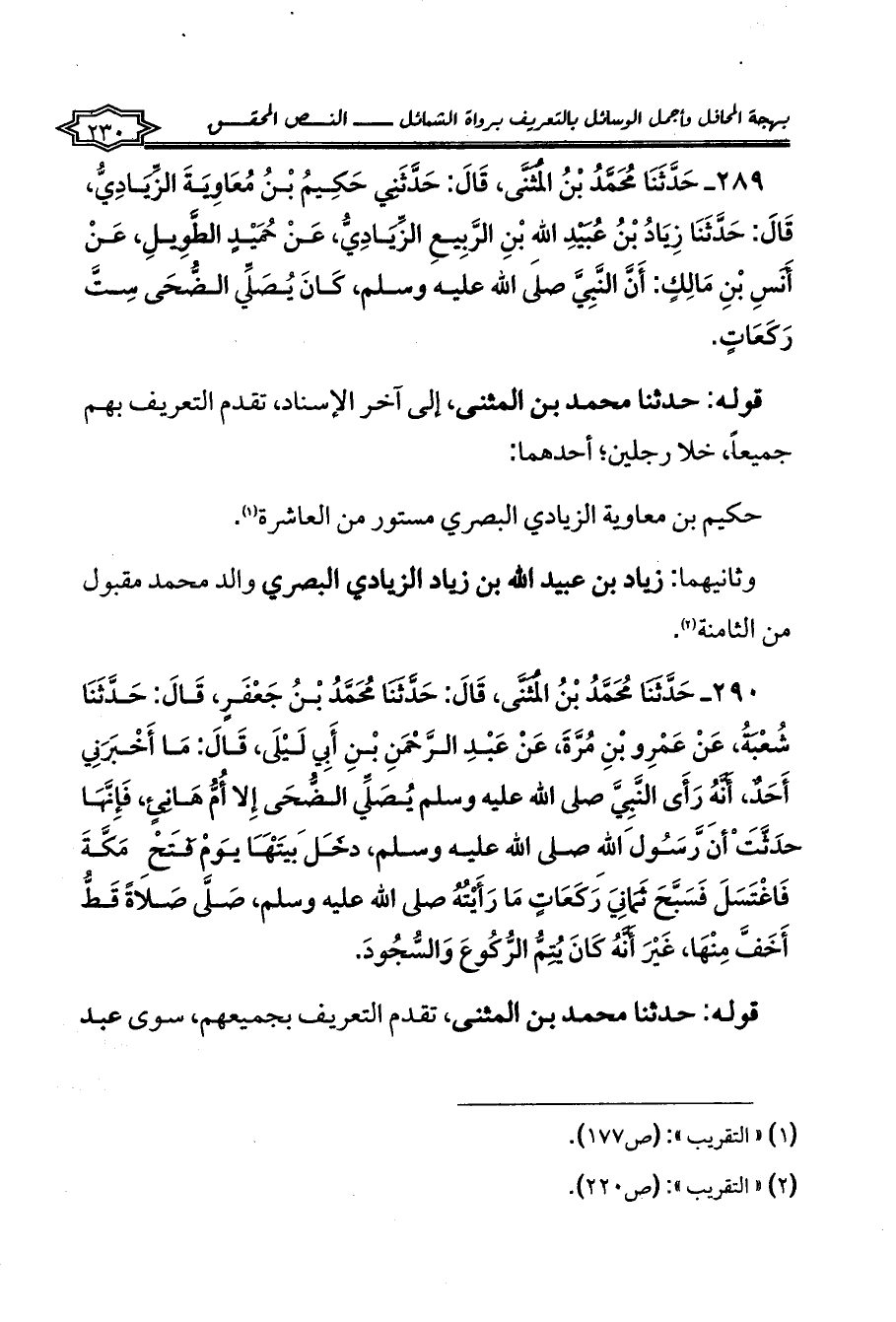 289 - حَدَّثَنَا مُحَمَّدُ بْنُ الْمُثَنَّى، قَالَ: حَدَّثَنِي حَكِيمُ بْنُ مُعَاوِيَةَ الزِّيَادِيُّ، قَالَ: حَدَّثَنَا زِيَادُ بْنُ عُبَيْدِ اللهِ بْنِ الرَّبِيعِ الزِّيَادِيُّ، عَنْ حُمَيْدٍ الطَّوِيلِ، عَنْ أَنَسِ بْنِ مَالِكٍ: أَنَّ النَّبِيَّ صلى الله عليه وسلم، كَانَ يُصَلِّي الضُّحَى سِتَّ رَكَعَاتٍ.