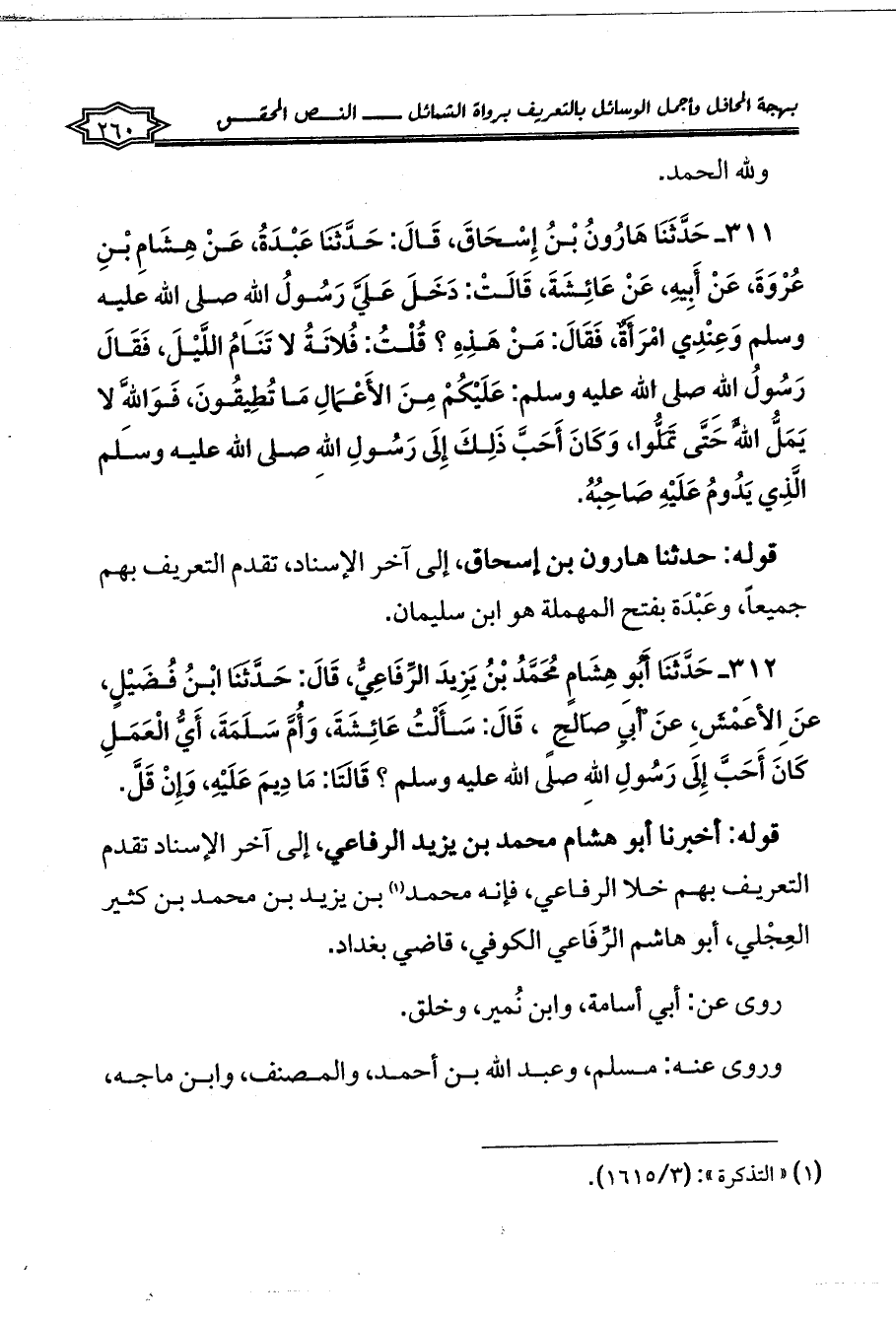311 - حَدَّثَنَا هَارُونُ بْنُ إِسْحَاقَ، قَالَ: حَدَّثَنَا عَبْدَةُ، عَنْ هِشَامِ بْنِ عُرْوَةَ، عَنْ أَبِيهِ، عَنْ عَائِشَةَ، قَالَتْ: دَخَلَ عَلَيَّ رَسُولُ اللهِ صلى الله عليه وسلم وَعِنْدِي امْرَأَةٌ، فَقَالَ: مَنْ هَذِهِ؟ قُلْتُ: فُلانَةُ لا تَنَامُ اللَّيْلَ، فَقَالَ رَسُولُ اللهِ صلى الله عليه وسلم: عَلَيْكُمْ مِنَ الأَعْمَالِ مَا تُطِيقُونَ، فَوَاللَّهِ لا يَمَلُّ اللَّهُ حَتَّى تَمَلُّوا، وَكَانَ أَحَبَّ ذَلِكَ إِلَى رَسُولِ اللهِ صلى الله عليه وسلم الَّذِي يَدُومُ عَلَيْهِ صَاحِبُهُ.