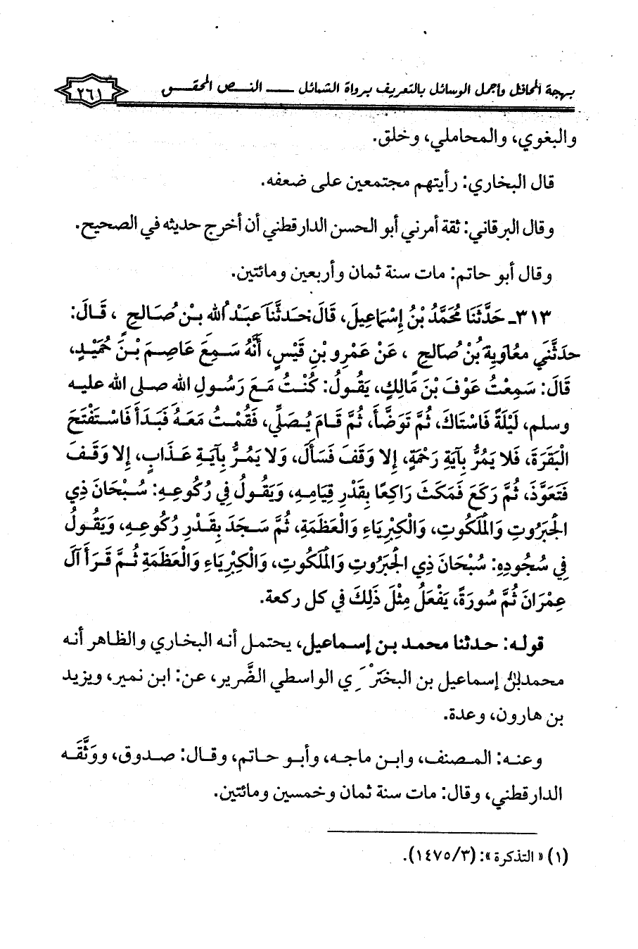313 - حَدَّثَنَا مُحَمَّدُ بْنُ إِسْمَاعِيلَ، قَالَ: حَدَّثَنَا عَبْدُ اللهِ بْنُ صَالِحٍ، قَالَ: حَدَّثَنِي مُعَاوِيَةُ بْنُ صَالِحٍ، عَنْ عَمْرِو بْنِ قَيْسٍ، أَنَّهُ سَمِعَ عَاصِمَ بْنَ حُمَيْدٍ، قَالَ: سَمِعْتُ عَوْفَ بْنَ مَالِكٍ، يَقُولُ: كُنْتُ مَعَ رَسُولِ اللهِ صلى الله عليه وسلم، لَيْلَةً فَاسْتَاكَ، ثُمَّ تَوَضَّأَ، ثُمَّ قَامَ يُصَلِّي، فَقُمْتُ مَعَهُ فَبَدَأَ فَاسْتَفْتَحَ الْبَقَرَةَ، فَلا يَمُرُّ بِآيَةِ رَحْمَةٍ، إِلا وَقَفَ فَسَأَلَ، وَلا يَمُرُّ بِآيَةِ عَذَابٍ، إِلا وَقَفَ فَتَعَوَّذَ، ثُمَّ رَكَعَ فَمَكَثَ رَاكِعًا بِقَدْرِ قِيَامِهِ، وَيَقُولُ فِي رُكُوعِهِ: سُبْحَانَ ذِي الْجَبَرُوتِ وَالْمَلَكُوتِ، وَالْكِبْرِيَاءِ وَالْعَظَمَةِ، ثُمَّ سَجَدَ بِقَدْرِ رُكُوعِهِ، وَيَقُولُ فِي سُجُودِهِ: سُبْحَانَ ذِي الْجَبَرُوتِ وَالْمَلَكُوتِ، وَالْكِبْرِيَاءِ وَالْعَظَمَةِ ثُمَّ قَرَأَ آلَ عِمْرَانَ ثُمَّ سُورَةً، يَفْعَلُ مِثْلَ ذَلِكَ في كل ركعة.
