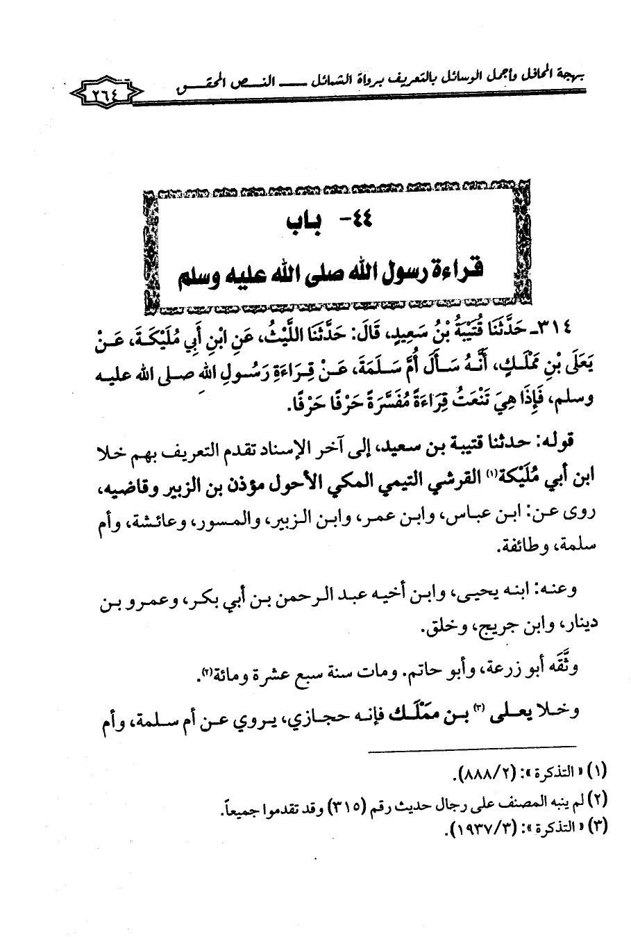 314 - حَدَّثَنَا قُتَيْبَةُ بْنُ سَعِيدٍ، قَالَ: حَدَّثَنَا اللَّيْثُ، عَنِ ابْنِ أَبِي مُلَيْكَةَ، عَنْ يَعَلَى بْنِ مَمْلَكٍ، أَنَّهُ سَأَلَ أُمَّ سَلَمَةَ، عَنْ قِرَاءَةِ رَسُولِ اللهِ صلى الله عليه وسلم، فَإِذَا هِيَ تَنْعَتُ قِرَاءَةً مُفَسَّرَةً حَرْفًا حَرْفًا.