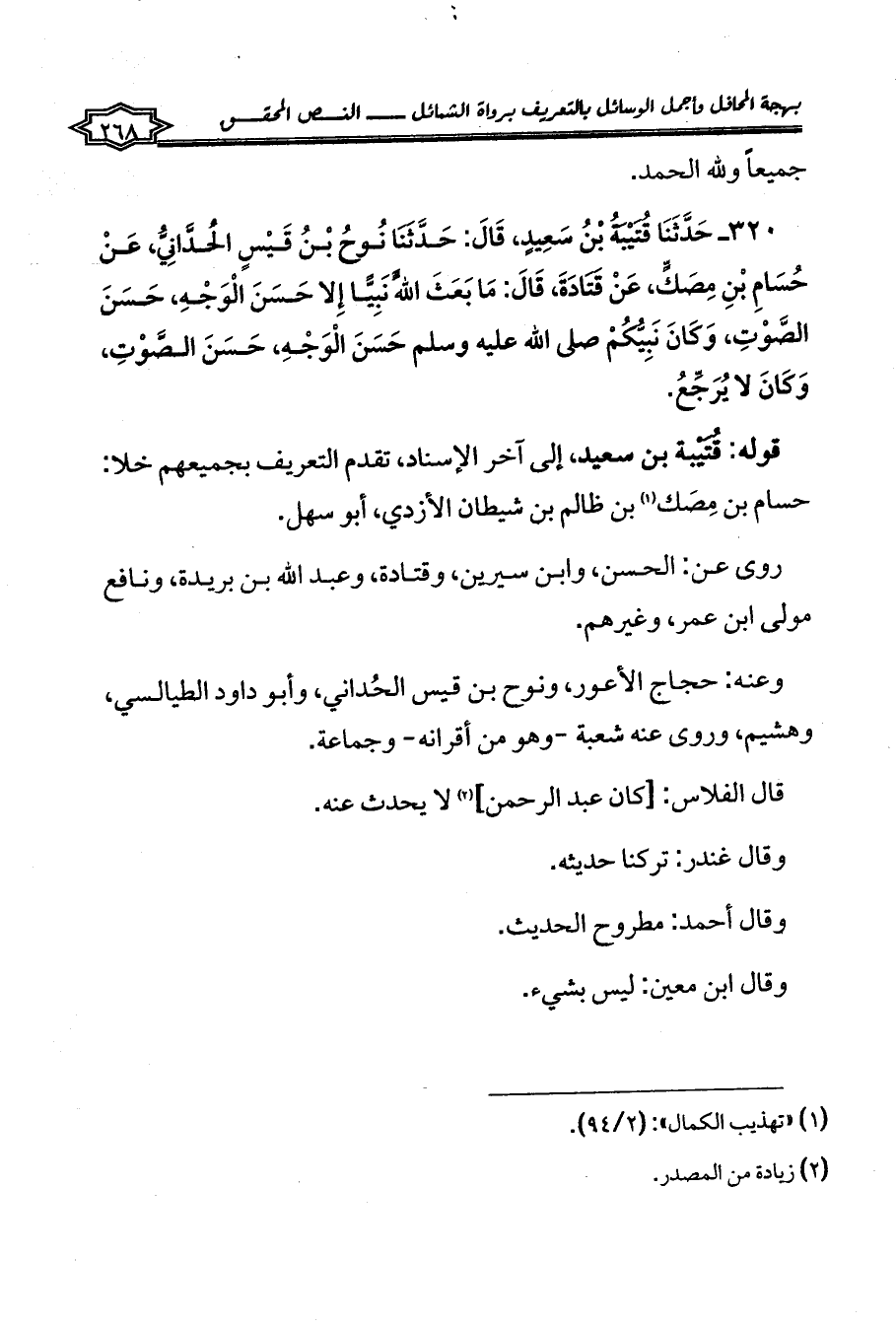 320 - حَدَّثَنَا قُتَيْبَةُ بْنُ سَعِيدٍ، قَالَ: حَدَّثَنَا نُوحُ بْنُ قَيْسٍ الْحُدَّانِيُّ، عَنْ حُسَامِ بْنِ مِصَكٍّ، عَنْ قَتَادَةَ، قَالَ: مَا بَعَثَ اللَّهُ نَبِيًّا إِلا حَسَنَ الْوَجْهِ، حَسَنَ الصَّوْتِ، وَكَانَ نَبِيُّكُمْ صلى الله عليه وسلم حَسَنَ الْوَجْهِ، حَسَنَ الصَّوْتِ، وَكَانَ لا يُرَجِّعُ.