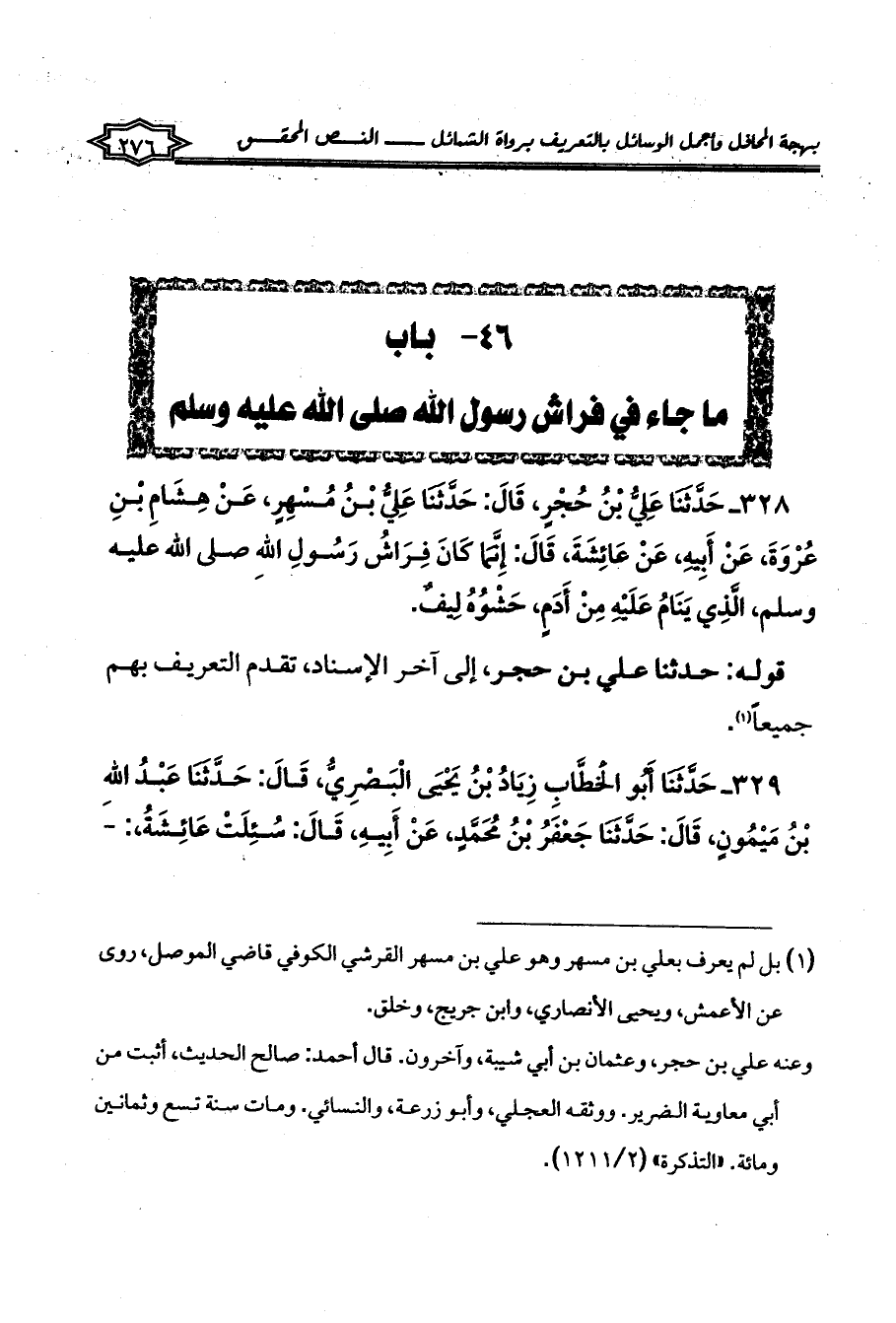 328 - حَدَّثَنَا عَلِيُّ بْنُ حُجْرٍ، قَالَ: حَدَّثَنَا عَلِيُّ بْنُ مُسْهِرٍ، عَنْ هِشَامِ بْنِ عُرْوَةَ، عَنْ أَبِيهِ، عَنْ عَائِشَةَ، قَالَ: إِنَّمَا كَانَ فِرَاشُ رَسُولِ اللهِ صلى الله عليه وسلم، الَّذِي يَنَامُ عَلَيْهِ مِنْ أَدَمٍ، حَشْوُهُ لِيفٌ.