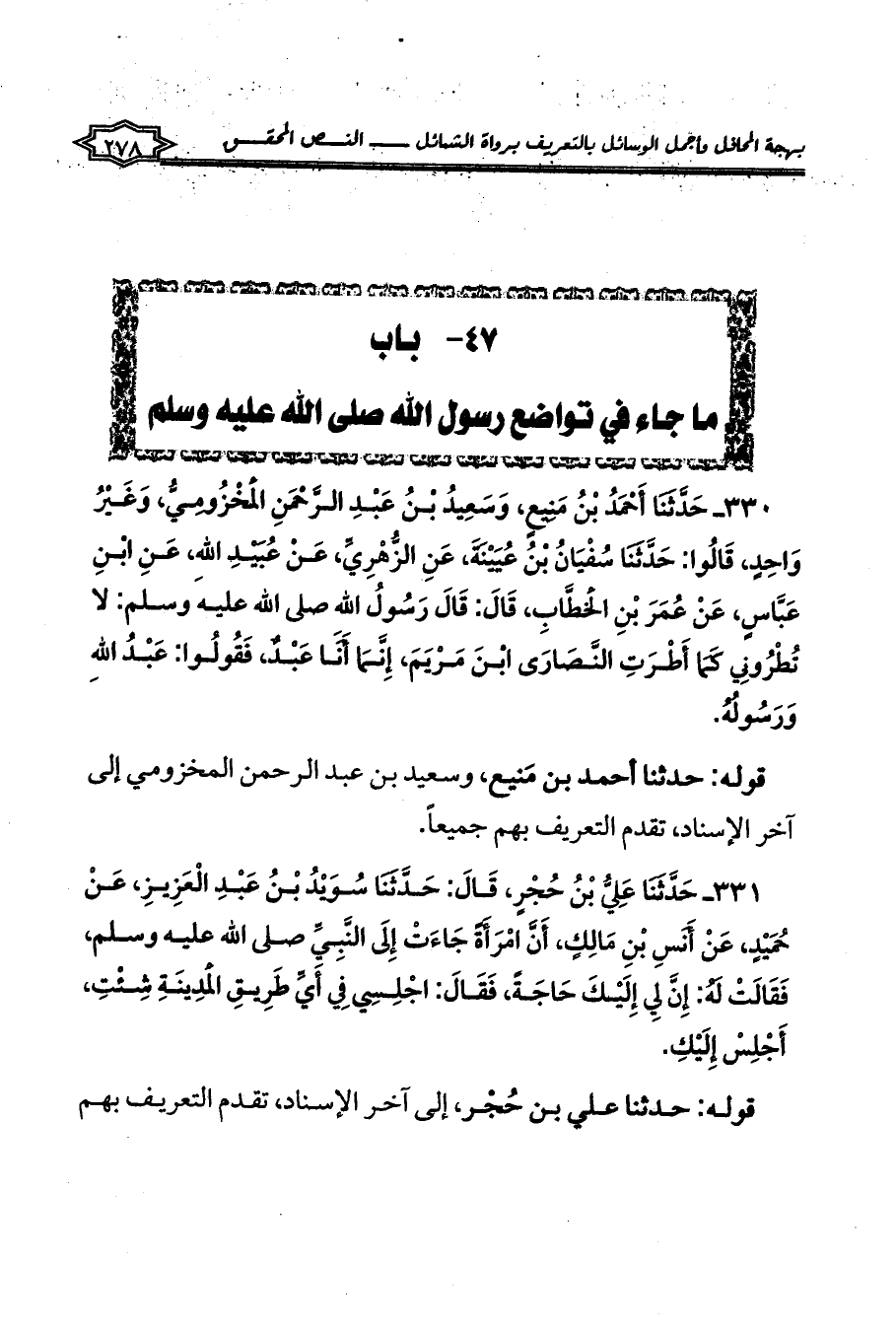 330 - حَدَّثَنَا أَحْمَدُ بْنُ مَنِيعٍ، وَسَعِيدُ بْنُ عَبْدِ الرَّحْمَنِ الْمَخْزُومِيُّ، وَغَيْرُ وَاحِدٍ، قَالُوا: حَدَّثَنَا سُفْيَانُ بْنُ عُيَيْنَةَ، عَنِ الزُّهْرِيِّ، عَنْ عُبَيْدِ اللهِ، عَنِ ابْنِ عَبَّاسٍ، عَنْ عُمَرَ بْنِ الْخَطَّابِ، قَالَ: قَالَ رَسُولُ اللهِ صلى الله عليه وسلم: لا تُطْرُونِي كَمَا أَطْرَتِ النَّصَارَى ابْنَ مَرْيَمَ، إِنَّمَا أَنَا عَبْدٌ، فَقُولُوا: عَبْدُ اللهِ وَرَسُولُهُ.