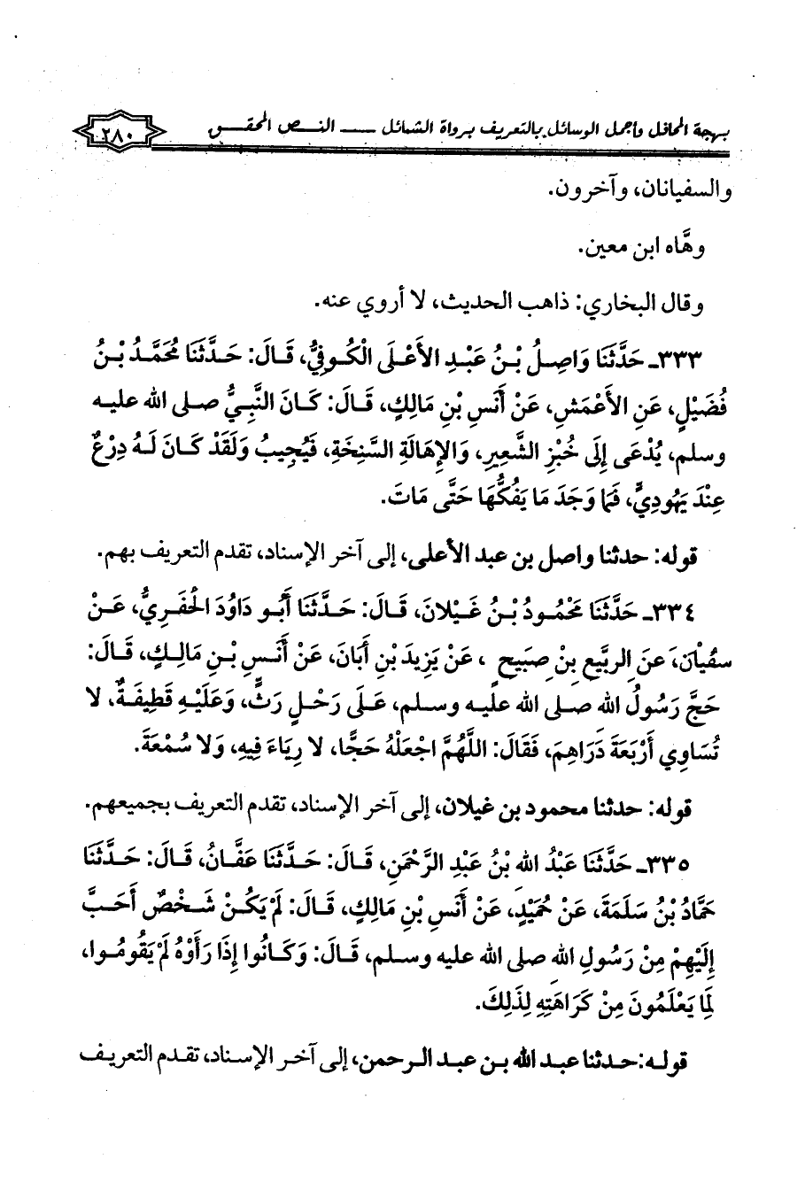 333 - حَدَّثَنَا وَاصِلُ بْنُ عَبْدِ الأَعْلَى الْكُوفِيُّ، قَالَ: حَدَّثَنَا مُحَمَّدُ بْنُ فُضَيْلٍ، عَنِ الأَعْمَشِ، عَنْ أَنَسِ بْنِ مَالِكٍ، قَالَ: كَانَ النَّبِيُّ صلى الله عليه وسلم، يُدْعَى إِلَى خُبْزِ الشَّعِيرِ، وَالإِهَالَةِ السَّنِخَةِ، فَيُجِيبُ وَلَقَدْ كَانَ لَهُ دِرْعٌ عِنْدَ يَهُودِيٍّ، فَمَا وَجَدَ مَا يَفُكُّهَا حَتَّى مَاتَ.