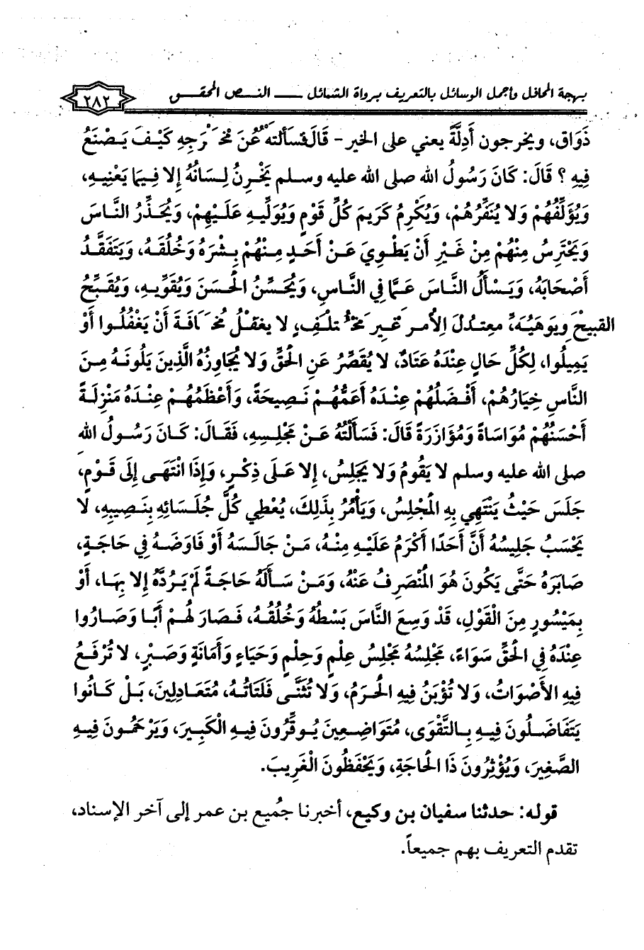 ذَوَاق، ويخرجون أَدِلَّةً يعني على الخير- قَالَ: فَسَأَلْتُهُ عَنْ مَخْرَجِهِ كَيْفَ يَصْنَعُ فِيهِ؟ قَالَ: كَانَ رَسُولُ اللهِ صلى الله عليه وسلم يَخْرِنُ لِسَانُهُ إِلا فِيمَا يَعْنِيهِ، وَيُؤَلِّفُهُمْ وَلا يُنَفِّرُهُمْ، وَيُكْرِمُ كَرَيمَ كُلِّ قَوْمٍ وَيُوَلِّيهِ عَلَيْهِمْ، وَيُحَذِّرُ النَّاسَ وَيَحْتَرِسُ مِنْهُمْ مِنْ غَيْرِ أَنْ يَطْوِيَ عَنْ أَحَدٍ مِنْهُمْ بِشْرَهُ وَخُلُقَهُ، وَيَتَفَقَّدُ أَصْحَابَهُ، وَيَسْأَلُ النَّاسَ عَمَّا فِي النَّاسِ، وَيُحَسِّنُ الْحَسَنَ وَيُقَوِّيهِ، وَيُقَبِّحُ الْقَبِيحَ وَيُوَهِّيهِ، مُعْتَدِلُ الأَمْرِ غَيْرُ مُخْتَلِفٍ، لا يَغْفُلُ مَخَافَةَ أَنْ يَغْفُلُوا أَوْ يَمِيلُوا، لِكُلِّ حَالٍ عِنْدَهُ عَتَادٌ، لا يُقَصِّرُ عَنِ الْحَقِّ وَلا يُجَاوِزُهُ الَّذِينَ يَلُونَهُ مِنَ النَّاسِ خِيَارُهُمْ، أَفْضَلُهُمْ عِنْدَهُ أَعَمُّهُمْ نَصِيحَةً، وَأَعْظَمُهُمْ عِنْدَهُ مَنْزِلَةً أَحْسَنُهُمْ مُوَاسَاةً وَمُؤَازَرَةً قَالَ: فَسَأَلْتُهُ عَنْ مَجْلِسِهِ، فَقَالَ: كَانَ رَسُولُ اللهِ صلى الله عليه وسلم لا يَقُومُ وَلا يَجَلِسُ، إِلا عَلَى ذِكْرٍ، وَإِذَا انْتَهَى إِلَى قَوْمٍ، جَلَسَ حَيْثُ يَنْتَهِي بِهِ الْمَجْلِسُ، وَيَأْمُرُ بِذَلِكَ، يُعْطِي كُلَّ جُلَسَائِهِ بِنَصِيبِهِ، لا يَحْسَبُ جَلِيسُهُ أَنَّ أَحَدًا أَكْرَمُ عَلَيْهِ مِنْهُ، مَنْ جَالَسَهُ أَوْ فَاوَضَهُ فِي حَاجَةٍ، صَابَرَهُ حَتَّى يَكُونَ هُوَ الْمُنْصَرِفُ عَنْهُ، وَمَنْ سَأَلَهُ حَاجَةً لَمْ يَرُدَّهُ إِلا بِهَا، أَوْ بِمَيْسُورٍ مِنَ الْقَوْلِ، قَدْ وَسِعَ النَّاسَ بَسْطُهُ وَخُلُقُهُ، فَصَارَ لَهُمْ أَبًا وَصَارُوا عِنْدَهُ فِي الْحَقِّ سَوَاءً، مَجْلِسُهُ مَجْلِسُ عِلْمٍ وَحِلْمٍ وَحَيَاءٍ وَأَمَانَةٍ وَصَبْرٍ، لا تُرْفَعُ فِيهِ الأَصْوَاتُ، وَلا تُؤْبَنُ فِيهِ الْحُرَمُ، وَلا تُثَنَّى فَلَتَاتُهُ، مُتَعَادِلِينَ، بَلْ كَانُوا يَتَفَاضَلُونَ فِيهِ بِالتَّقْوَى، مُتَوَاضِعِينَ يُوقِّرُونَ فِيهِ الْكَبِيرَ، وَيَرْحَمُونَ فِيهِ
