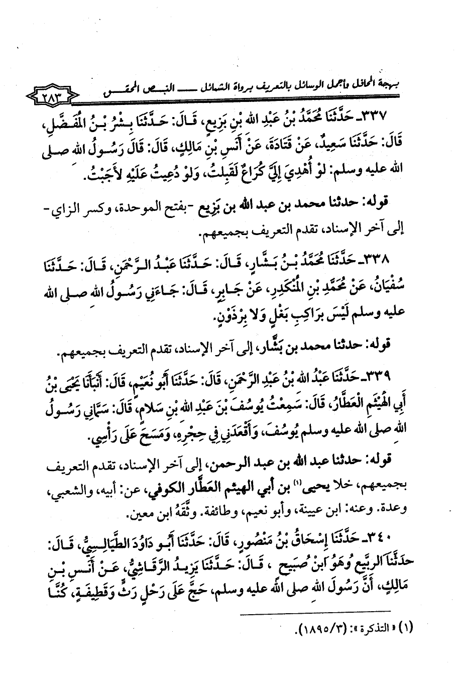 338 - حَدَّثَنَا مُحَمَّدُ بْنُ بَشَّارٍ، قَالَ: حَدَّثَنَا عَبْدُ الرَّحْمَنِ، قَالَ: حَدَّثَنَا سُفْيَانُ، عَنْ مُحَمَّدِ بْنِ الْمُنْكَدِرِ، عَنْ جَابِرٍ، قَالَ: جَاءَنِي رَسُولُ اللهِ صلى الله عليه وسلم لَيْسَ برَاكِبِ بَغْلٍ وَلا بِرْذَوْنٍ.