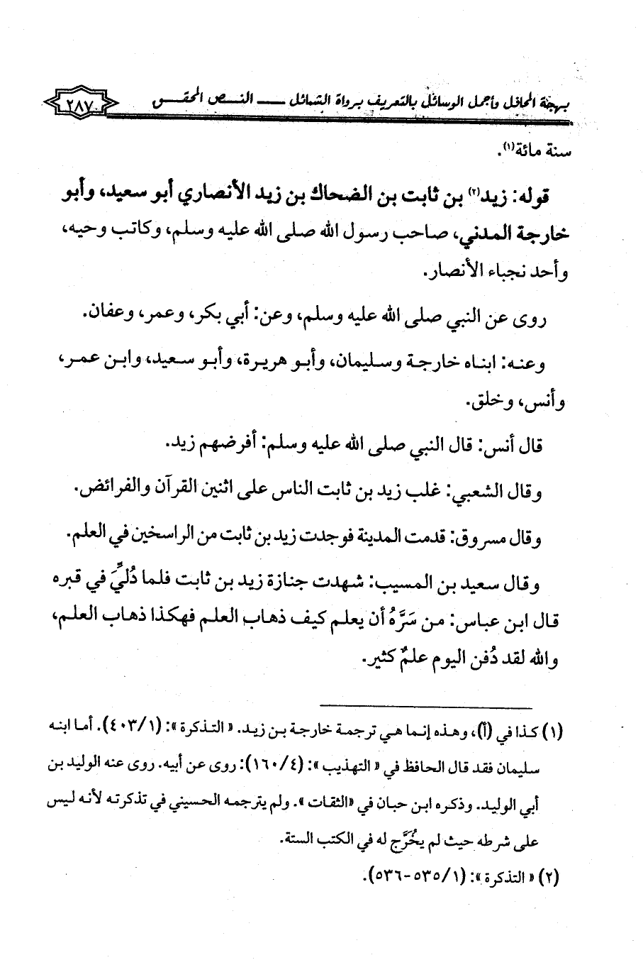 (¬1) كذا في (أ)، وهذه إنما هي ترجمة خارجة بن زيد. «التذكرة»: (1/ 403). أما ابنه سليمان فقد قال الحافظ في «التهذيب»: (4/ 160): روى عن أبيه. روى عنه الوليد بن أبي الوليد. وذكره ابن حبان في «الثقات». ولم يترجمه الحسيني في تذكرته لأنه ليس على شرطه حيث لم يُخَرَّج له في الكتب الستة.