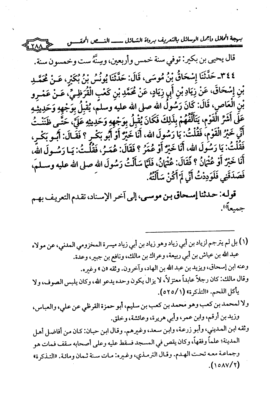 344 - حَدَّثَنَا إِسْحَاقُ بْنُ مُوسَى، قَالَ: حَدَّثَنَا يُونُسُ بْنُ بُكَيْرٍ، عَنْ مُحَمَّدِ بْنِ إِسْحَاقَ، عَنْ زِيَادِ بْنِ أَبِي زِيَادٍ، عَنْ مُحَمَّدِ بْنِ كَعْبٍ الْقُرَظِيِّ، عَنْ عَمْرِو بْنِ الْعَاصِ، قَالَ: كَانَ رَسُولُ اللهِ صلى الله عليه وسلم، يُقْبِلُ بِوَجْهِهِ وَحَدِيثِهِ عَلَى أَشَرِّ الْقَوْمِ، يَتَأَلَّفُهُمْ بِذَلِكَ فَكَانَ يُقْبِلُ بِوَجْهِهِ وَحَدِيثِهِ عَلَيَّ، حَتَّى ظَنَنْتُ أَنِّي خَيْرُ الْقَوْمِ، فَقُلْتُ: يَا رَسُولَ اللهِ، أَنَا خَيْرٌ أَوْ أَبُو بَكْرٍ؟ فَقَالَ: أَبُو بَكْرٍ، فَقُلْتُ: يَا رَسُولَ اللهِ، أَنَا خَيْرٌ أَوْ عُمَرُ؟ فَقَالَ: عُمَرُ، فَقُلْتُ: يَا رَسُولَ اللهِ، أَنَا خَيْرٌ أَوْ عُثْمَانُ؟ فَقَالَ: عُثْمَانُ، فَلَمَّا سَأَلْتُ رَسُولَ اللهِ صلى الله عليه وسلم، فَصَدَقَنِي فَلَوَدِدْتُ أَنِّي لَمْ أَكُنْ سَأَلْتُهُ.