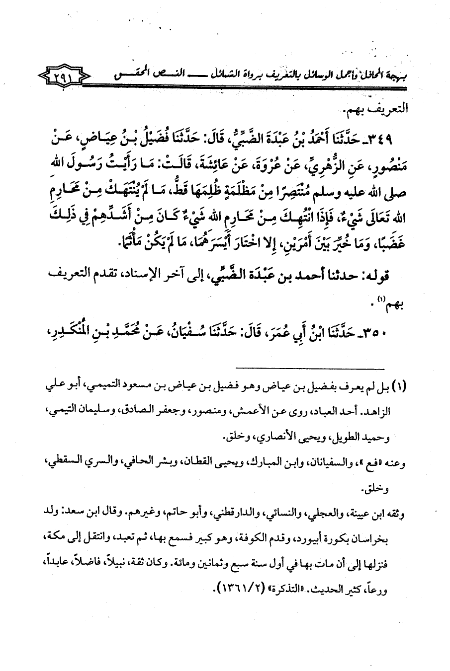 349 - حَدَّثَنَا أَحْمَدُ بْنُ عَبْدَةَ الضَّبِّيُّ، قَالَ: حَدَّثَنَا فُضَيْلُ بْنُ عِيَاضٍ، عَنْ مَنْصُورٍ، عَنِ الزُّهْرِيِّ، عَنْ عُرْوَةَ، عَنْ عَائِشَةَ، قَالَتْ: مَا رَأَيْتُ رَسُولَ اللهِ صلى الله عليه وسلم مُنْتَصِرًا مِنْ مَظْلَمَةٍ ظُلِمَهَا قَطُّ، مَا لَمْ يُنْتَهَكْ مِنْ مَحَارِمِ اللهِ تَعَالَى شَيْءٌ، فَإِذَا انْتُهِكَ مِنْ مَحَارِمِ اللهِ شَيْءٌ كَانَ مِنْ أَشَدِّهِمْ فِي ذَلِكَ غَضَبًا، وَمَا خُيِّرَ بَيْنَ أَمْرَيْنِ، إِلا اخْتَارَ أَيْسَرَهُمَا، مَا لَمْ يَكُنْ مَأْثَمًا.