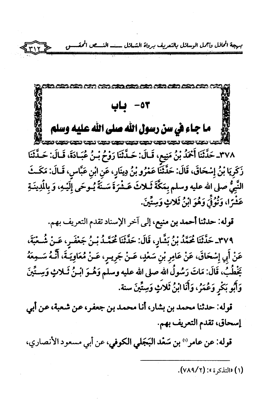 379 - حَدَّثَنَا مُحَمَّدُ بْنُ بَشَّارٍ، قَالَ: حَدَّثَنَا مُحَمَّدُ بْنُ جَعْفَرٍ، عَنْ شُعْبَةَ، عَنْ أَبِي إِسْحَاقَ، عَنْ عَامِرِ بْنِ سَعْدٍ، عَنْ جَرِيرٍ، عَنْ مُعَاوِيَةَ، أَنَّهُ سَمِعَهُ يَخْطُبُ، قَالَ: مَاتَ رَسُولُ اللهِ صلى الله عليه وسلم وَهُوَ ابْنُ ثَلاثٍ وَسِتِّينَ وَأَبُو بَكْرٍ وَعُمَرُ، وَأَنَا ابْنُ ثَلاثٍ وَسِتِّينَ سنة.