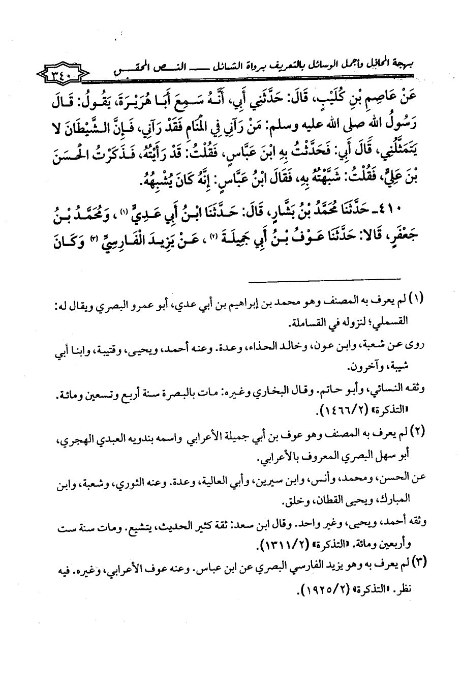 عَنْ عَاصِمِ بْنِ كُلَيْبٍ، قَالَ: حَدَّثَنِي أَبِي، أَنَّهُ سَمِعَ أَبَا هُرَيْرَةَ، يَقُولُ: قَالَ رَسُولُ اللهِ صلى الله عليه وسلم: مَنْ رَآنِي فِي الْمَنَامِ فَقَدْ رَآنِي، فَإِنَّ الشَّيْطَانَ لا يَتَمَثَّلُنِي، قَالَ أَبِي: فَحَدَّثْتُ بِهِ ابْنَ عَبَّاسٍ، فَقُلْتُ: قَدْ رَأَيْتُهُ، فَذَكَرْتُ الْحَسَنَ بْنَ عَلِيٍّ، فَقُلْتُ: شَبَّهْتُهُ بِهِ، فَقَالَ ابْنُ عَبَّاسٍ: إِنَّهُ كَانَ يُشْبِهُهُ.