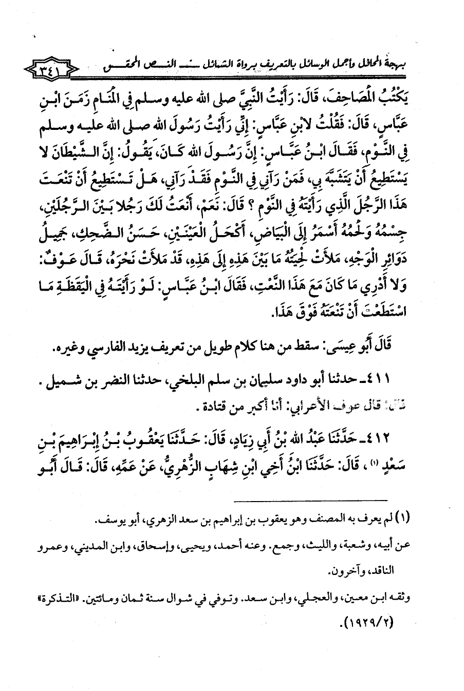 يَكْتُبُ الْمَصَاحِفَ، قَالَ: رَأَيْتُ النَّبِيَّ صلى الله عليه وسلم فِي الْمَنَامِ زَمَنَ ابْنِ عَبَّاسٍ، قَالَ: فَقُلْتُ لابْنِ عَبَّاسٍ: إِنِّي رَأَيْتُ رَسُولَ اللهِ صلى الله عليه وسلم فِي النَّوْمِ، فَقَالَ ابْنُ عَبَّاسٍ: إِنَّ رَسُولَ اللهِ كَانَ، يَقُولُ: إِنَّ الشَّيْطَانَ لا يَسْتَطِيعُ أَنْ يَتَشَبَّهَ بِي، فَمَنْ رَآنِي فِي النَّوْمِ فَقَدْ رَآنِي، هَلْ تَسْتَطِيعُ أَنْ تَنْعَتَ هَذَا الرَّجُلَ الَّذِي رَأَيْتَهُ فِي النَّوْمِ؟ قَالَ: نَعَمْ، أَنْعَتُ لَكَ رَجُلا بَيْنَ الرَّجُلَيْنِ، جِسْمُهُ وَلَحْمُهُ أَسْمَرُ إِلَى الْبَيَاضِ، أَكْحَلُ الْعَيْنَيْنِ، حَسَنُ الضَّحِكِ، جَمِيلُ دَوَائِرِ الْوَجْهِ، مَلأَتْ لِحْيَتُهُ مَا بَيْنَ هَذِهِ إِلَى هَذِهِ، قَدْ مَلأَتْ نَحْرَهُ، قَالَ عَوْفٌ: وَلا أَدْرِي مَا كَانَ مَعَ هَذَا النَّعْتِ، فَقَالَ ابْنُ عَبَّاسٍ: لَوْ رَأَيْتَهُ فِي الْيَقَظَةِ مَا اسْتَطَعْتَ أَنْ تَنْعَتَهُ فَوْقَ هَذَا.