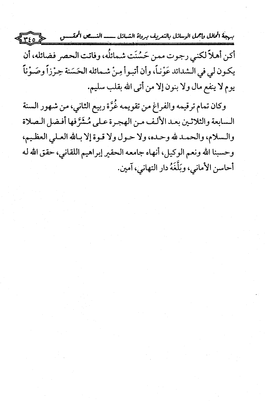 وكان تمام ترقيمه والفراغ من تقويمه غُرَّة ربيع الثاني، من شهور السنة السابعة والثلاثين بعد الألف من الهجرة على مُشَرَّفها أفضل الصلاة والسلام، والحمد لله وحده، ولا حول ولا قوة إلا بالله العلي العظيم، وحسبنا الله ونعم الوكيل، أنهاه جامعه الحقير إبراهيم اللقاني، حقق الله له أحاسن الأماني، وبَلَّغَهُ دار التهاني، آمين.