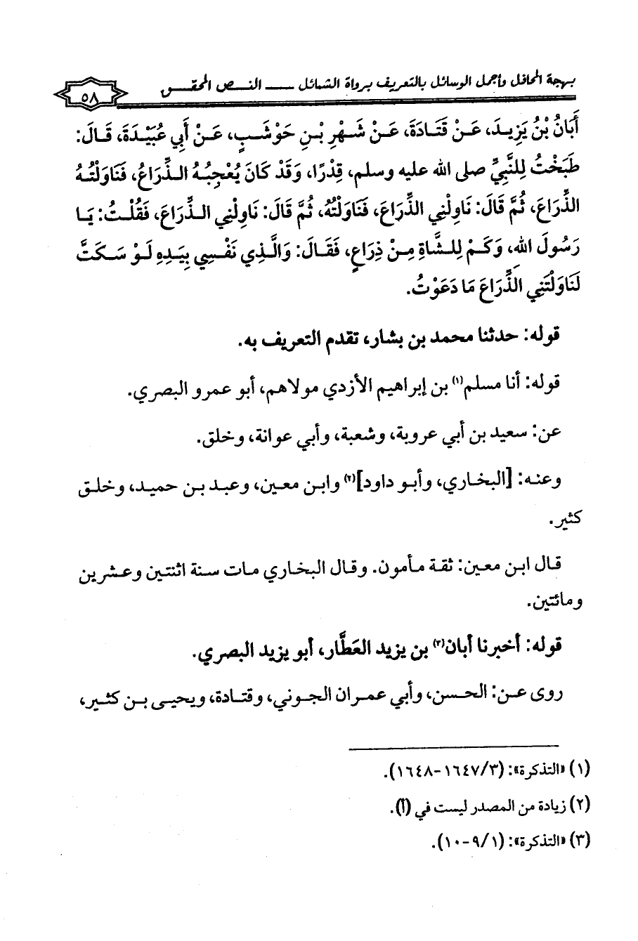 أَبَانُ بْنُ يَزِيدَ، عَنْ قَتَادَةَ، عَنْ شَهْرِ بْنِ حَوْشَبٍ، عَنْ أَبِي عُبَيْدَةَ، قَالَ: طَبَخْتُ لِلنَّبِيِّ صلى الله عليه وسلم، قِدْرًا، وَقَدْ كَانَ يُعْجِبُهُ الذِّرَاعُ، فَنَاوَلْتُهُ الذِّرَاعَ، ثُمَّ قَالَ: نَاوِلْنِي الذِّرَاعَ، فَنَاوَلْتُهُ، ثُمَّ قَالَ: نَاوِلْنِي الذِّرَاعَ، فَقُلْتُ: يَا رَسُولَ اللهِ، وَكَمْ لِلشَّاةِ مِنْ ذِرَاعٍ، فَقَالَ: وَالَّذِي نَفْسِي بِيَدِهِ لَوْ سَكَتَّ لَنَاوَلْتَنِي الذِّرَاعَ مَا دَعَوْتُ.