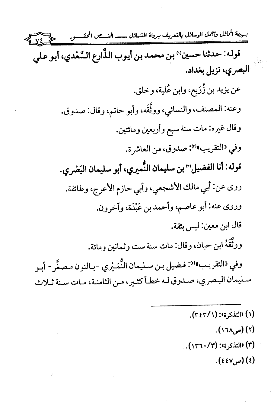وفي «التقريب» (¬4): فضيل بن سليمان النُّمَيْري -بالنون مصغَّر- أبو سليمان البصري، صدوق له خطأ كثير، من الثامنة، مات سنة ثلاث