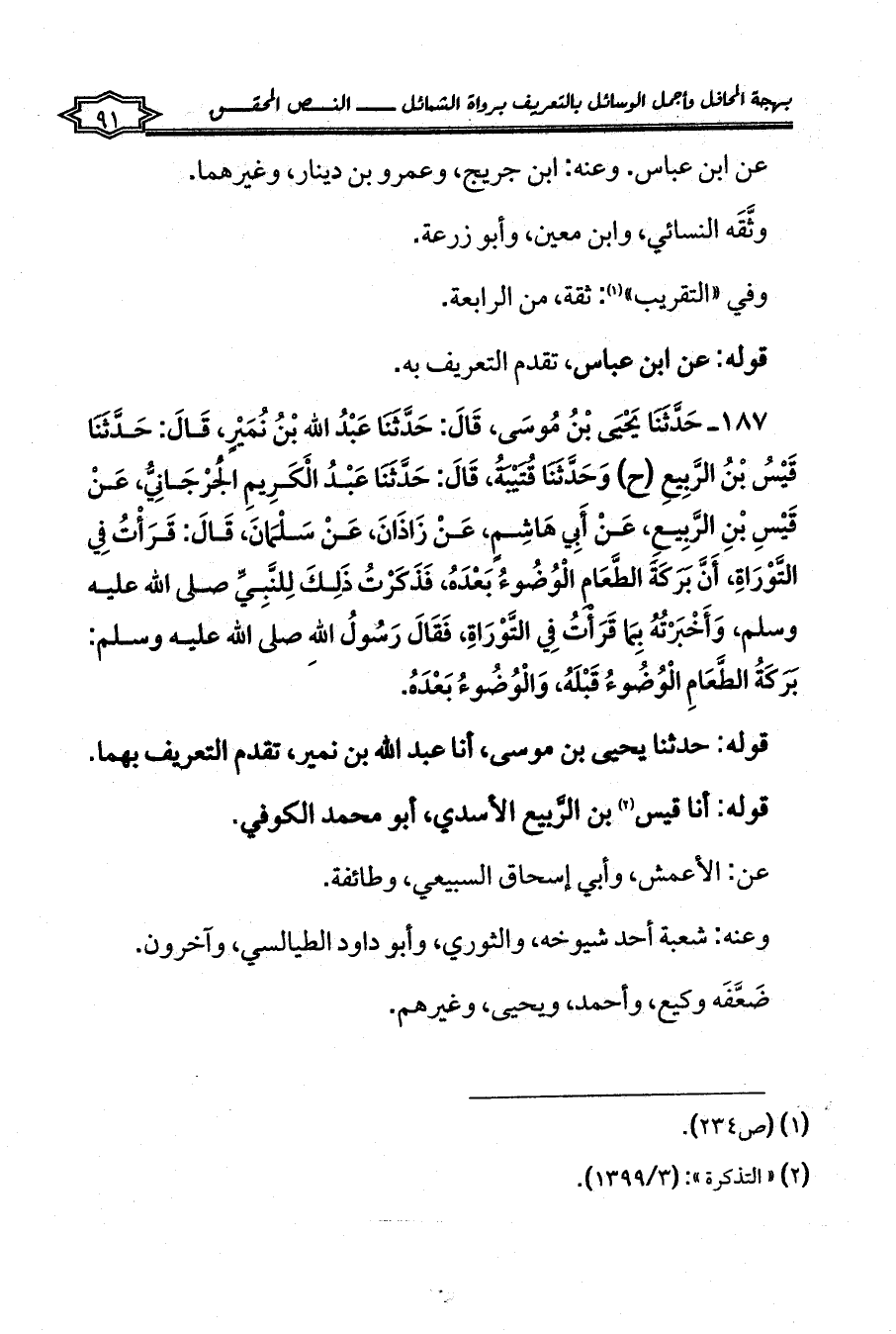 187 - حَدَّثَنَا يَحْيَى بْنُ مُوسَى، قَالَ: حَدَّثَنَا عَبْدُ اللهِ بْنُ نُمَيْرٍ، قَالَ: حَدَّثَنَا قَيْسُ بْنُ الرَّبِيعِ (ح) وَحَدَّثَنَا قُتَيْبَةُ، قَالَ: حَدَّثَنَا عَبْدُ الْكَرِيمِ الْجُرْجَانِيُّ، عَنْ قَيْسِ بْنِ الرَّبِيعِ، عَنْ أَبِي هَاشِمٍ، عَنْ زَاذَانَ، عَنْ سَلْمَانَ، قَالَ: قَرَأْتُ فِي التَّوْرَاةِ، أَنَّ بَرَكَةَ الطَّعَامِ الْوُضُوءُ بَعْدَهُ، فَذَكَرْتُ ذَلِكَ لِلنَّبِيِّ صلى الله عليه وسلم، وَأَخْبَرْتُهُ بِمَا قَرَأْتُ فِي التَّوْرَاةِ، فَقَالَ رَسُولُ اللهِ صلى الله عليه وسلم: بَرَكَةُ الطَّعَامِ الْوُضُوءُ قَبْلَهُ، وَالْوُضُوءُ بَعْدَهُ.