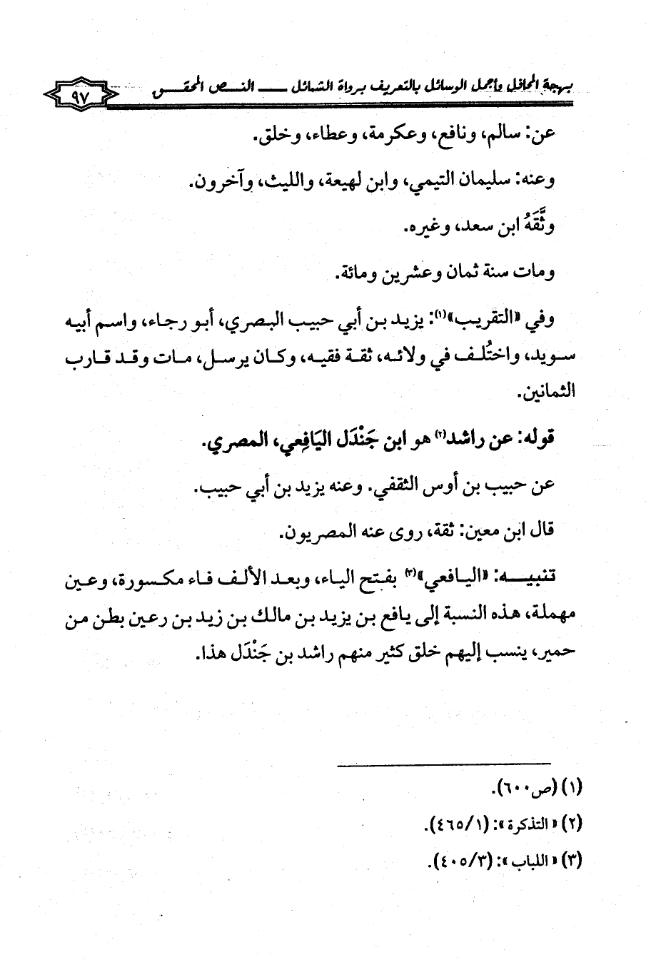 تنبيه: «اليافعي» (¬3) بفتح الياء، وبعد الألف فاء مكسورة، وعين مهملة، هذه النسبة إلى يافع بن يزيد بن مالك بن زيد بن رعين بطن من حمير، ينسب إليهم خلق كثير منهم راشد بن جَنْدَل هذا.