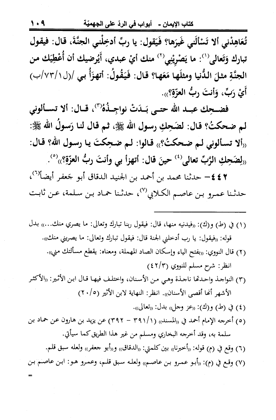 -[110]-[البناني] (¬3)، عن أَنس [بن مالكٍ] (¬4) عن عبد الله بن مسعُودٍ أنّ رسول الله -صلى الله عليه وسلم- قال: "آخر مَن يدخلُ الجنَّةَ رَجُلٌ يمشي على الصِّراطِ، فهو يَكبُو (¬5) مرةً، ويمشي مَرةً، وتسْفَعُهُ النار -فذكر نحوَ حديثِ يزيد بن هارون- قال: فَيَقُول: يا ربِّ، أتستهزئ بي وأنتَ ربُّ العالَمين؟ ".