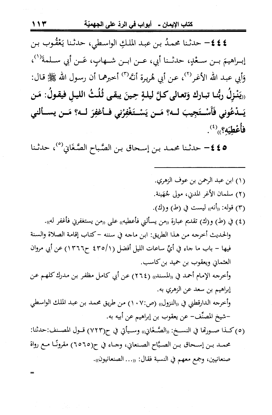 444 - حدثنا محمدُ بن عبد الملكِ الواسطي، حدثنا يَعْقُوب بن إبراهيمَ بن سعْدٍ، حدثنا أبي، عن ابن شهابٍ، عَن أبي سلمةَ (¬1)، وَأبي عبد الله الأغر (¬2)، عن أبي هُريرة أنَّه (¬3) أخبرهما أن رسول الله -صلى الله عليه وسلم- قال: "يَنْزِلُ ربُّنا تبارك وَتعالى كلَّ ليلةٍ حِينَ يبقى ثُلثُ الليلِ فيقولُ: مَن يَدْعُوني فَأَسْتَجِيبَ له؟ مَن يَسْتَغْفِرُني فأغفِرَ له؟ مَن يسألني فأُعْطِيَهِ؟ " (¬4).