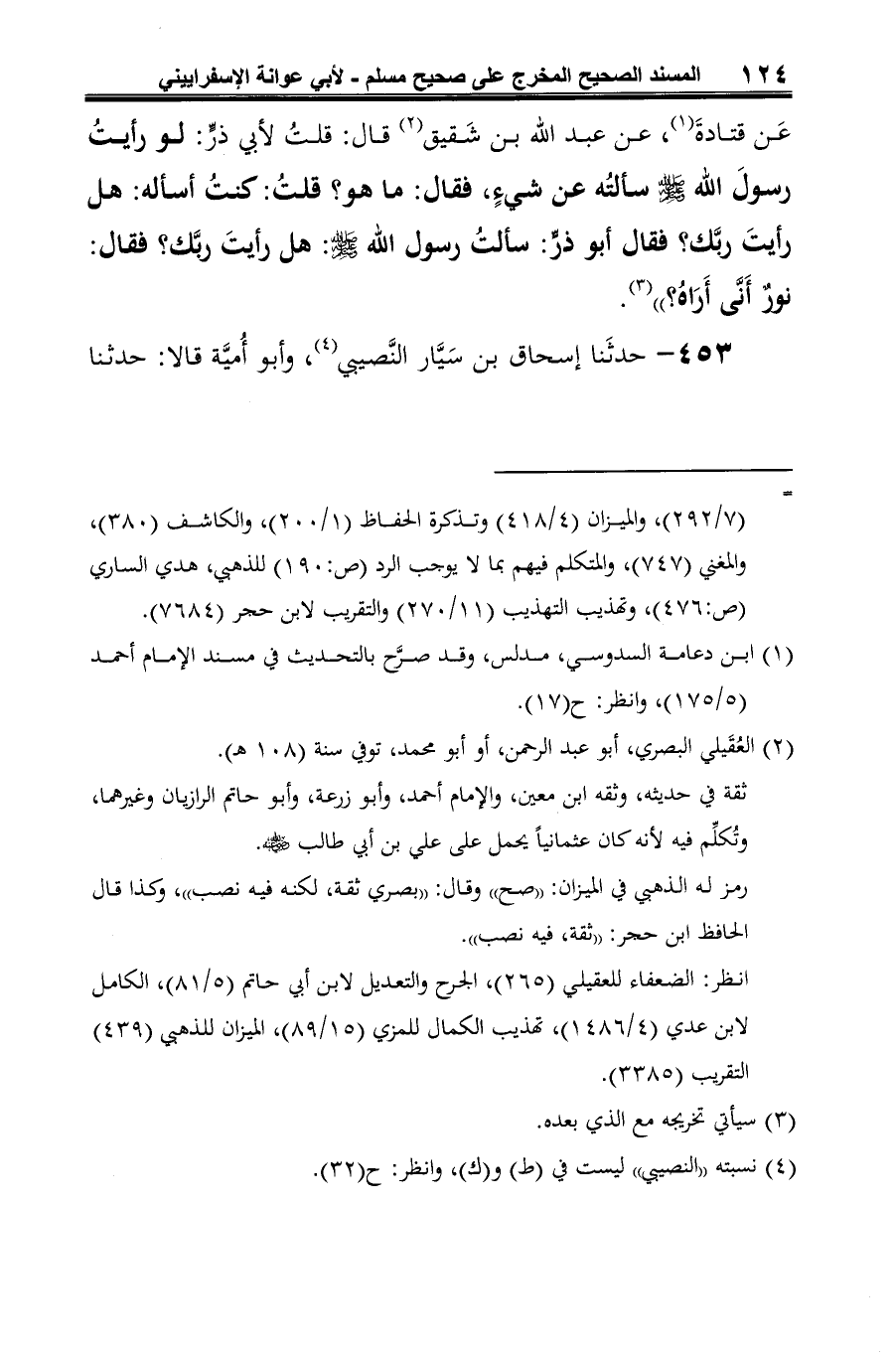-[126]- قال عثمانُ بن خُرَّزاذ (¬9): سمعتُ أحمدَ بن حَنْبل يقول: ما زلتُ مُنكِرًا لحديثِ يزيدَ بن إبراهيم حَتى حَدثنا عَفان، عن هَمام (¬10)، عن قتادة، عن عبد الله بن شقيق قال: قلتُ لأبي ذرٍّ: لو رأيتُ رسول الله -صلى الله عليه وسلم- لَسألْتُه، قال: سألتَه عَن ماذا؟ قال: قلتُ: هل رأيتَ ربَّك؟، فقال: سألتُهُ (¬11) فقال: "قد رأيتُ نورًا أَنَّى أَرَاهُ؟ " (¬12)