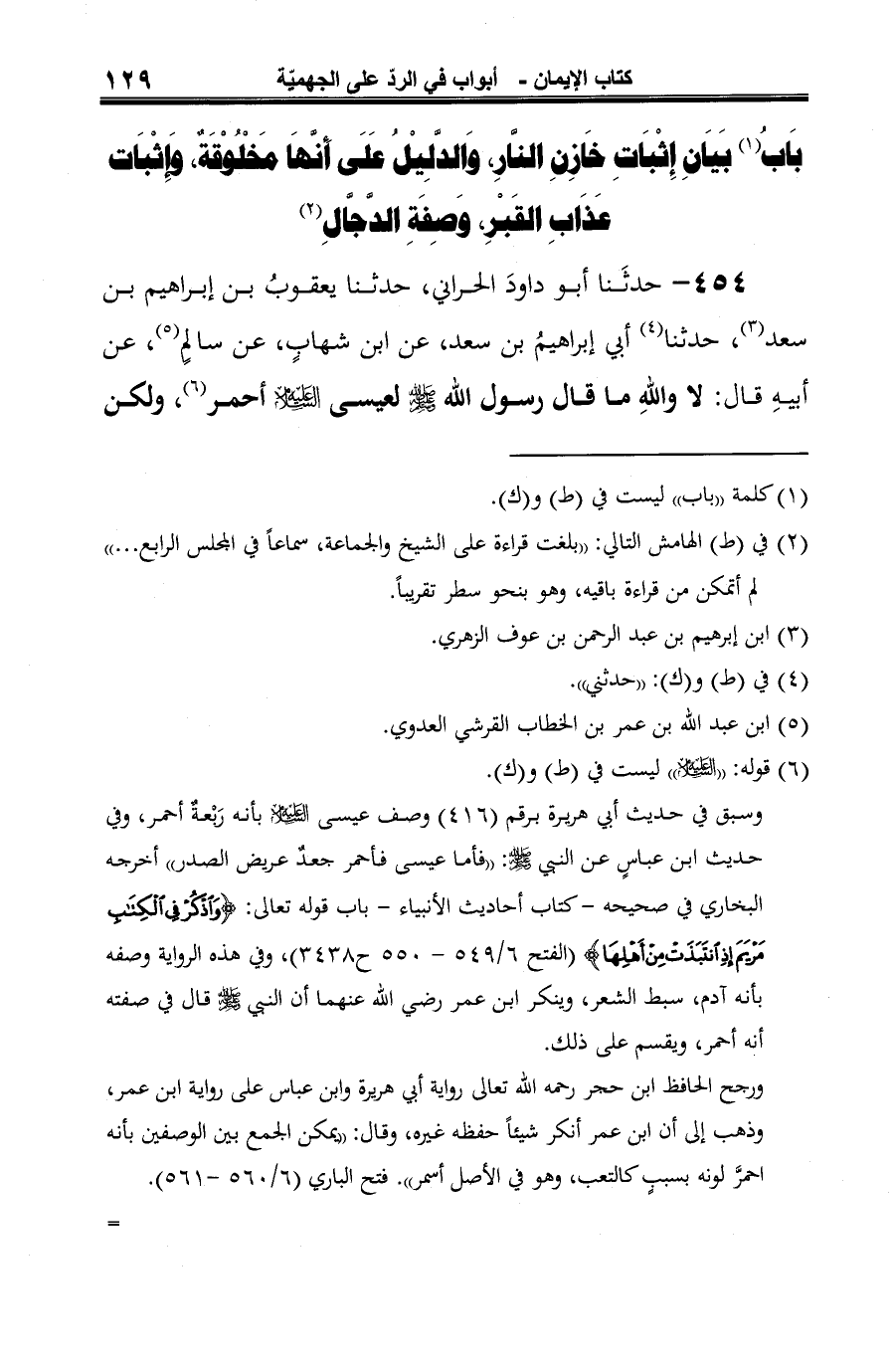 454 - حدثَنا أبو داودَ الحراني، حدثنا يعقوبٌ بن إبراهيم بن سعد (¬1)، حدثنا (¬2) أبي إبراهيمُ بن سعد، عن ابن شهابٍ، عن سالمٍ (¬3)، عن أبيهِ قال: لا واللهِ ما قال رسول الله -صلى الله عليه وسلم- لعيسى - عليه السلام - أحمر (¬4)، ولكن