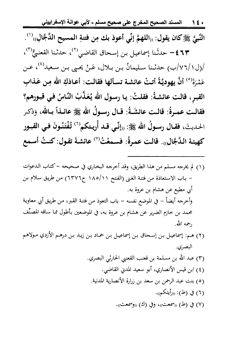 463 - حدثَنا إسماعيل بن إسحاق القاضي (¬1)، حدثنا القعنبيُّ (¬2)، حدثنا سليمانُ بن بلال، عَنْ يحيى بن سعيد (¬3)، عن عَمْرَةَ (¬4) أنَّ يهوديَّةً أتتْ عائشة تسألها فقالت: أعاذكِ الله مِن عَذابِ القبرِ، قالت عائشةُ: فقلتُ: يا رسول الله يُعَذَّبُ الناسُ في قبورهم؟ فقالت عمرةُ: قالت عائشَةُ: قال رسولُ الله -صلى الله عليه وسلم- عائذًا بالله، وَذكر الحديثَ، فقال رسولُ الله -صلى الله عليه وسلم-: "إنِّي قد أُريتكم (¬5) تُفْتَنُونَ في القبور كهيئة الدَّجَّال". قالت عمرةُ: فسمعْتُ (¬6) عائشةَ تقول: كنتُ أسمع