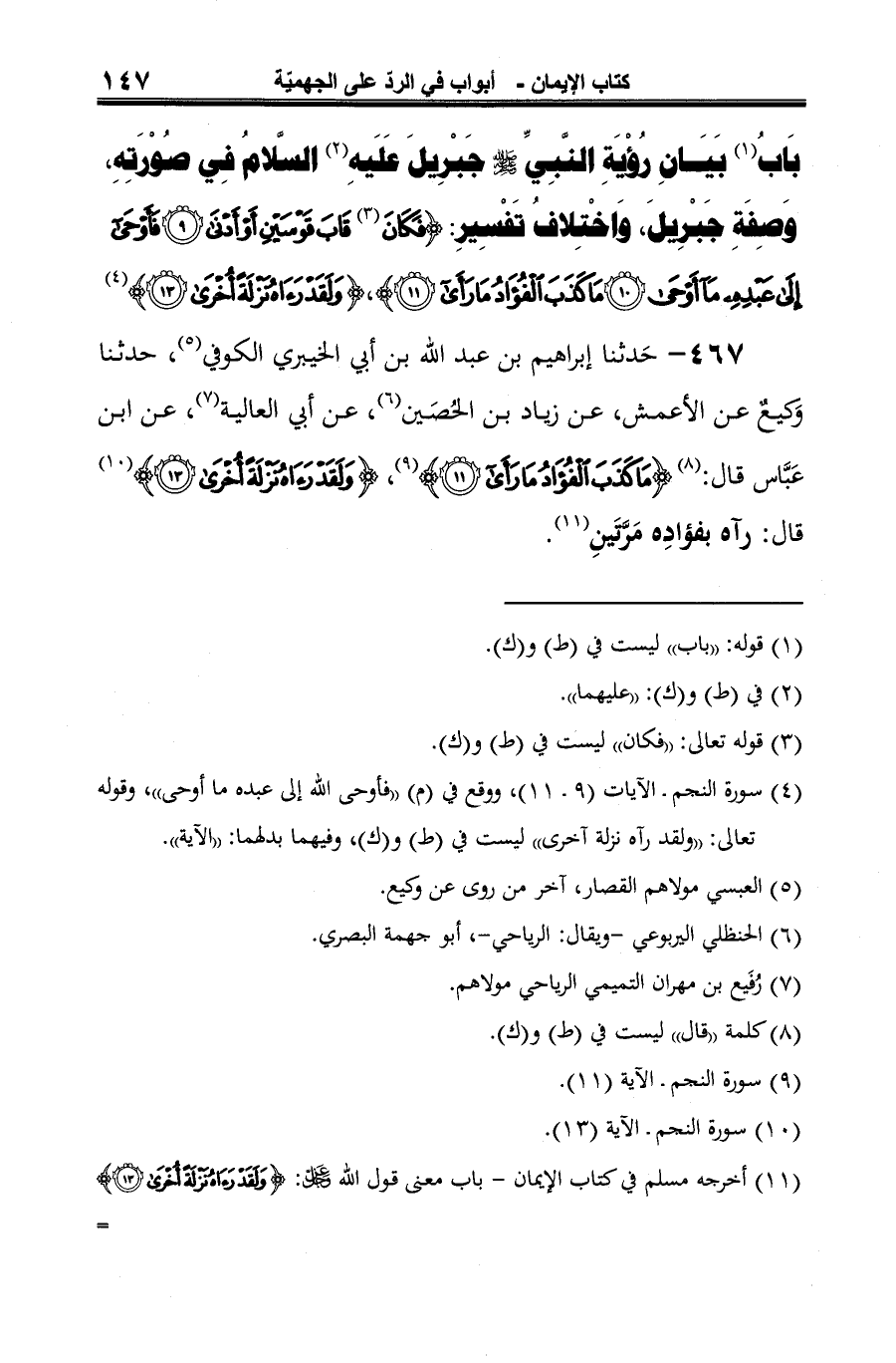 467 - حَدثنا إبراهيم بن عبد الله بن أبي الخيبري الكوفي (¬1)، حدثنا وكيعٌ عن الأعمش، عن زياد بن الحُصَين (¬2)، عن أبي العالية (¬3)، عن ابن عَبَّاس قال: (¬4) {ما كَذَبَ الْفُؤَادُ مَا رَأَى (11)} (¬5)، {وَلَقَدْ رَآهُ نَزْلَةً أُخْرَى (13)} (¬6) قال: رآه بفؤادِه مَرَّتينِ (¬7).