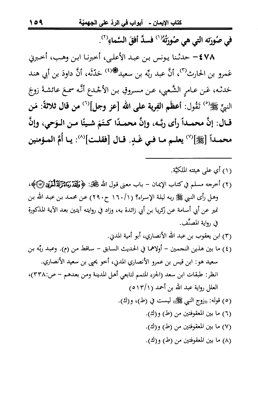 478 - حدثنا يونس بن عبد الأعلى، أخبرنا ابن وهب، أخبرني عَمرو بن الحارث (¬1)، أنَّ عبد ربِّه بن سعيد (¬2) حَدّثَه، أنَّ داودَ بن أبي هند حَدثه، عَن عامرٍ الشَّعبي، عن مسروقِ بن الأجْدع أنَّه سمعَ عائشةَ زوجَ النبي -صلى الله عليه وسلم- (¬3) تَقُول: أعظَم الفِرية على الله [عز وجل] (¬4) من قال ثلاثةً: مَن قال: إنَّ محمدًا رأى ربَّه، وإنَّ محمدًا كتَمَ شيئًا من الوَحي، وإنَّ محمدًا [-صلى الله عليه وسلم-] (¬5) يعلم ما في غَدٍ. قال [فقلت] (¬6): يا أُمَّ المؤمنين
