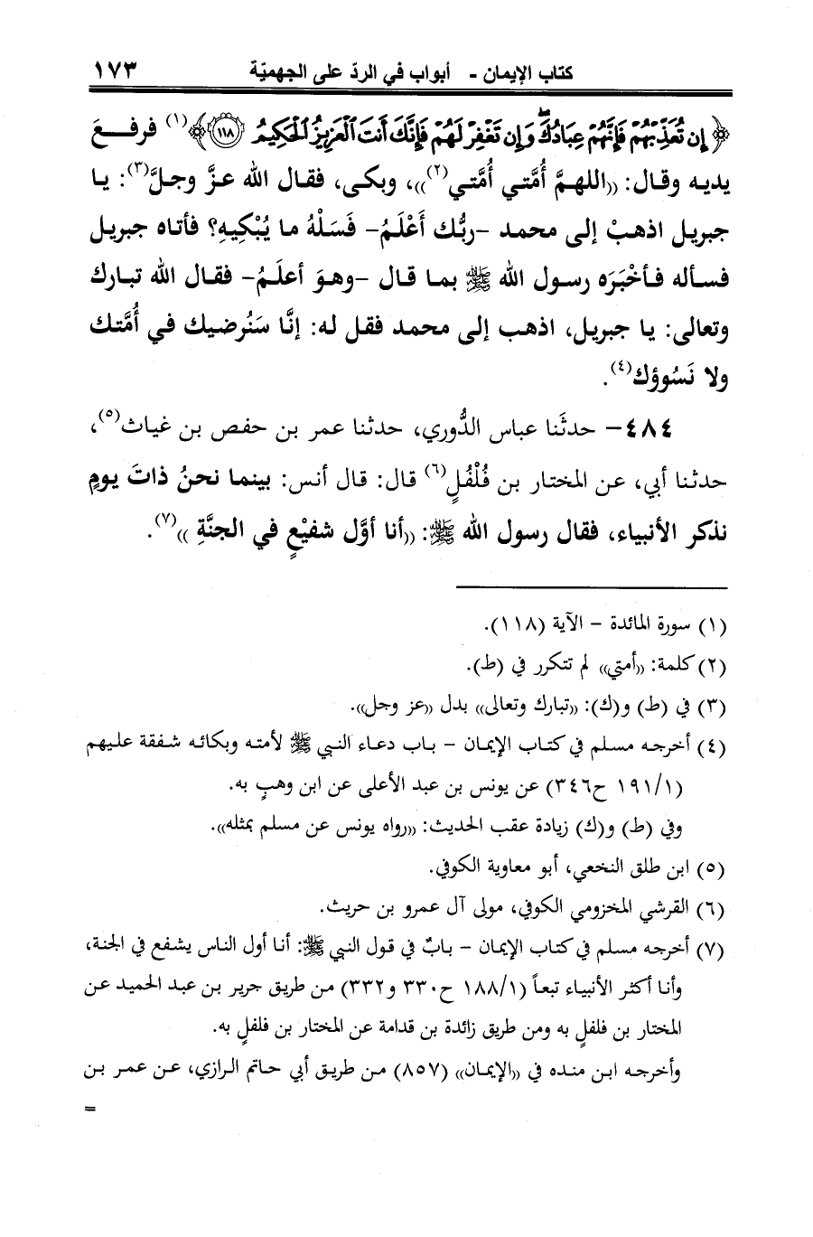 (¬3) أخرجه مسلم في كتاب الإيمان -بابٌ في قول النبي -صلى الله عليه وسلم-: أنا أول الناس يشفع في الجنة، وأنا أكثر الأنبياء تبعًا (1/ 188 ح 330 و 332) من طريق جرير بن عبد الحميد عن المختار بن فلفلٍ به ومن طريق زائدة بن قدامة عن المختار بن فلفلٍ به.