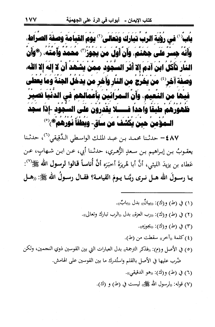 بُابٌ (¬1) في رُؤْيَةِ الرَّبِّ تَبَارك وَتَعَالَى (¬2) يَوْم القِيَامَة وَصفَةِ الصرَاط، وأنهُ جِسرٌ علَى جَهنَّم، وأن أولَ مَنْ يجوز (¬3) محمدٌ وأمتُهُ، (وأنَّ النَّار تأكلُ ابنِ آدم إِلَّا أَثَرَ السجوْد مِمنْ يَشهَدُ أنْ لا إِلَهَ إِلَّا الله، وَصفَةِ آخِرِ (¬4) منْ يَخْرُجُ مِن النار وآخِرِ مَن يَدْخُلُ الجَنة وَمَا يُعْطَى فِيْها مِن النَّعِيْمِ، وَأن المُرَائِيْنَ بِأعمَالهمْ في الدُّنْيَا تصيْرُ ظُهوررُهُمْ طَبَقًا وَاحدًا فَلا يَقْدرُونَ علَى السّجوْد -إِذَا سجدَ المُؤْمِنُ حِيْنَ يُكْشف عَن ساقٍ- وَيطفَأ نُوْرُهُمْ) (¬5)