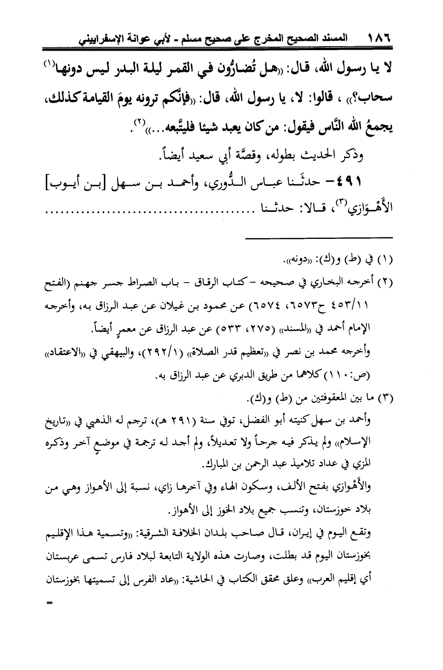 -[187]- عبد الرحمن بن المبارك (¬2)، حدثنا قريش بن حَيَّان (¬3)، عن بكر بن وائل (¬4)، عن الزهريّ، عن أبي عبد الله الأَغَر (¬5) -كذا قال- عن أبي هريرة قال: قلنا: يا رسول الله، هل نرى ربَّنا؟ قال: نعَم، هل تُضارُّون في الشمس ليس دونها سحاب؟ قلنا: لا .... " (¬6). وذكر الحديثَ بطوله، وفيه قصَّة أبي سعيد أيضًا، وَفيه زيادات.