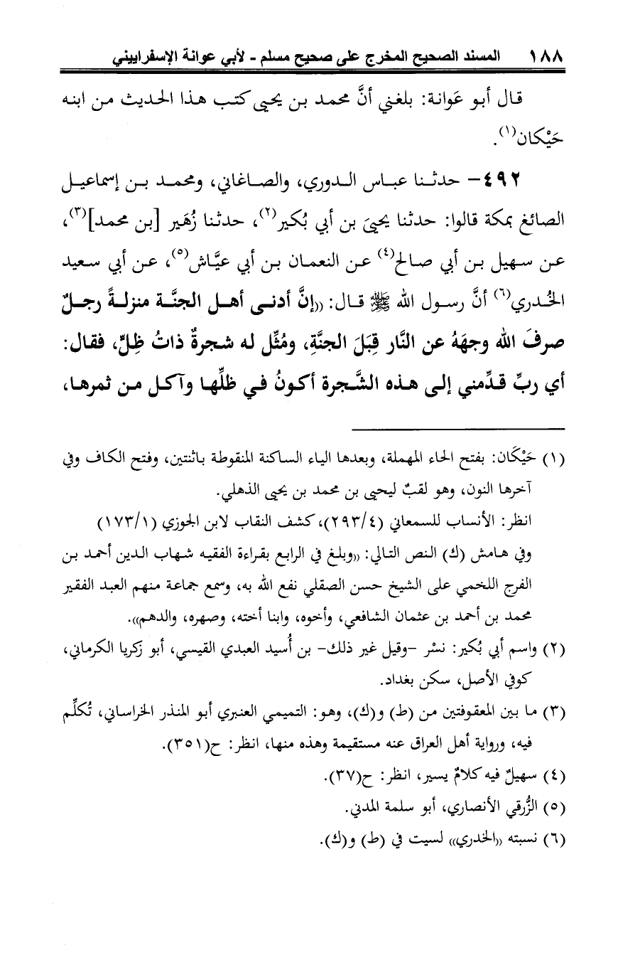 492 - حدثنا عباس الدوري، والصاغاني، ومحمد بن إسماعيل الصائغ بمكة قالوا: حدثنا يحيى بن أبي بُكير (¬1)، حدثنا زُهَير [بن محمد] (¬2)، عن سهيل بن أبي صالح (¬3) عن النعمان بن أبي عيَّاش (¬4)، عن أبي سعيد الخُدري (¬5) أنَّ رسول الله -صلى الله عليه وسلم- قال: "إنَّ أدنى أهل الجنَّة منزلةً رجلٌ صرفَ الله وجهَهُ عن النَّار قِبَلَ الجنَّةِ، ومُثِّل له شجرةٌ ذاتُ ظِلٍّ، فقال: أي ربِّ قدِّمني إلى هذه الشَّجرة أكونُ في ظلِّها وآكل من ثمرها،