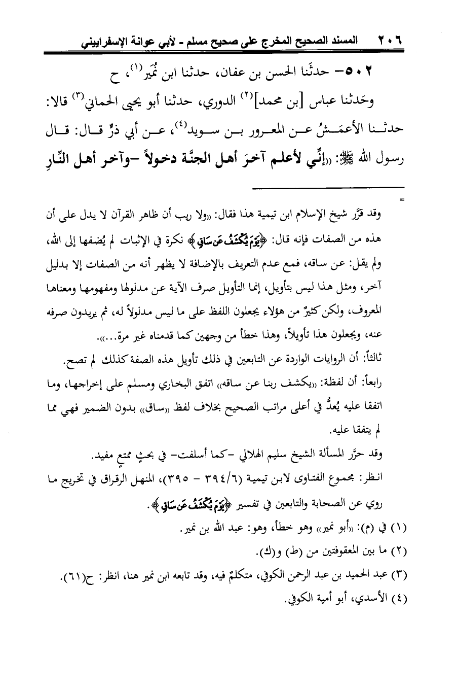 وحَدثنا عباس [بن محمد] (¬2) الدوري، حدثنا أبو يحيى الحماني (¬3) قالا: حدثنا الأعمَشُ عن المعرور بن سويد (¬4)، عن أبي ذرٍّ قال: قال رسول الله -صلى الله عليه وسلم-: "إنِّي لأعلم آخرَ أهل الجنَّة دخولًا -وآخر أهل النِّارِ